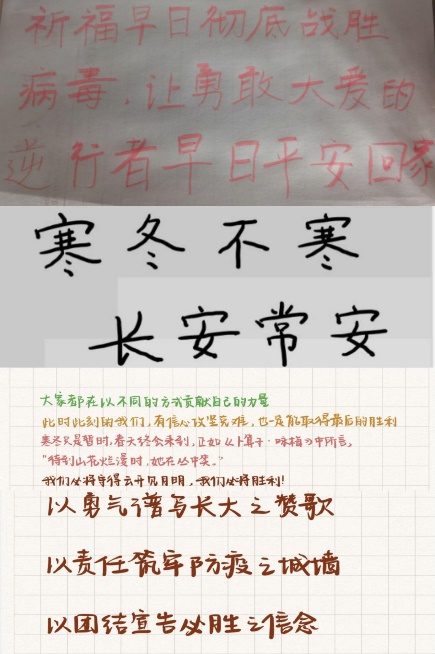 在美高梅娱乐城 、各级政府、全国人民的多重关护下,学生们乐观积极,已做好即将开展新学期学习的准备工作。正如同学们手写的抗疫祝福语:以勇气谱写长大之赞歌,以责任筑牢防疫之城墙,以团结宣告必胜之信念!待到春暖花开的季节,愿所求皆所愿,山河无恙,岁月安康!