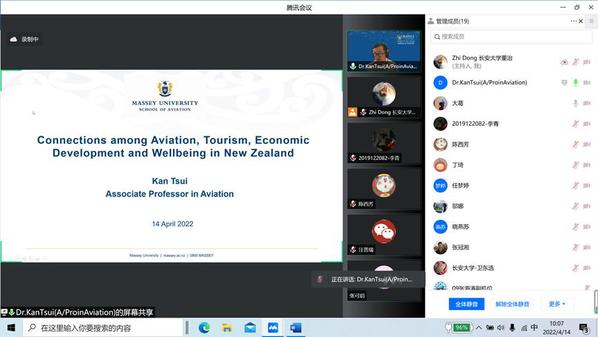 2022年4月14日上午10点,新西兰梅西大学航空美高梅娱乐城 Kan Tsui副教授应邀为美高梅娱乐城 师生在线作了题为“Connection between aviation, economies and wellbeing: Evidence from New Zealand”的学术报告;院长葛颖恩教授主持了报告会。