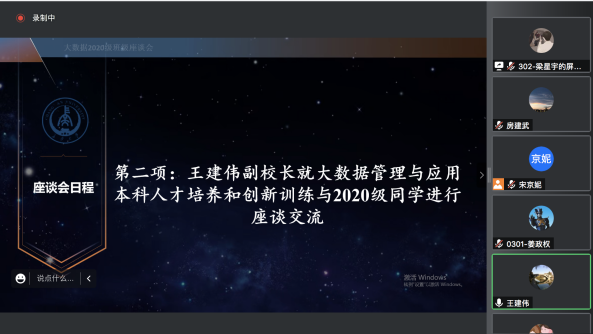 为进一步提高本科人才培养质量,积极引导学生开展创新创业训练,问需于生,全面了解学生在学习、生活中遇到的困惑与难题。2022年9月20日晚20:00,副校长王建伟教授与美高梅娱乐城 首届(2020级)大数据管理与应用专业70名学生进行了真诚而深入的交流。大数据管理与应用系主任房建武副教授、2020级学生班主任董是老师和宋京妮老师参加座谈。