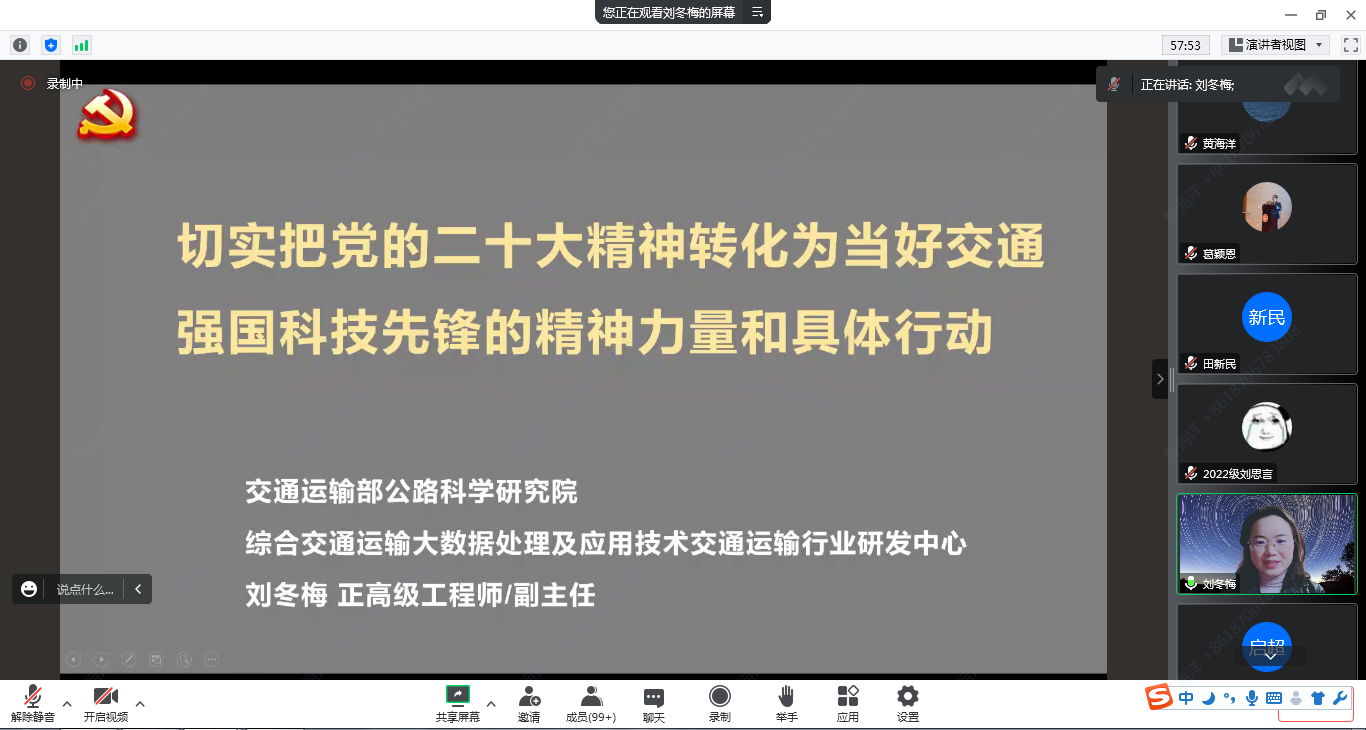 刘冬梅同志以“切实把党的二十大精神转化为当好交通强国科技先锋的精神力量和具体行动”为题作报告。她从“高举旗帜、凝聚力量、团结奋进的大会”,“深入学习领会贯彻党的二十大精神”、“牢记国之大者,埋头苦干奋勇前进” 三大部分,结合参加党的二十大的亲身感受和科研工作实际,分享了自己学习领会党的二十大精神主要内容、核心要义与实践要求的方法和体会。她提出我们作为“交通人”要深刻领悟“两个确立”的决定性意义,更好履行职能加强自身建设,提升能力水平,与中国共产党同心同德、团结奋斗,为加快建设交通强国做出应有贡献。