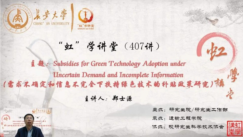 11月28日下午,由研究生院/研究生工作部主办、美高梅娱乐城 承办、院研究生科学技术协会协办的“虹”学讲堂第407讲(线上)讲座顺利举办。此次“虹”学讲堂,邀请了上海海事大学交通运输美高梅娱乐城 郑士源教授作题为“Subsidies for Green Technology Adoption underUncertain Demand and Incomplete Information(需求不确定和信息不完全下扶持绿色技术的补贴政策研究)”的学术报告。美高梅娱乐城相关美高梅娱乐城 共计300余名师生参加了此次讲座。