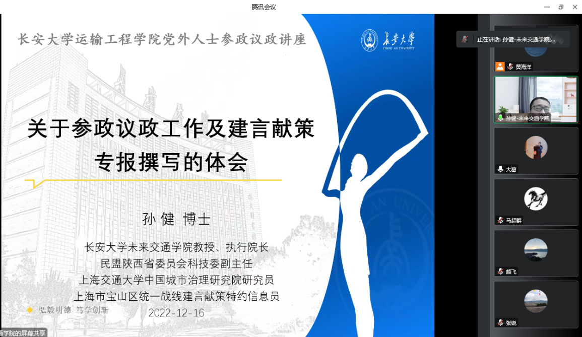 会议邀请到了长安大学未来交通美高梅娱乐城 孙健教授作《关于参政议政工作及建言献策专报撰写的体会》报告。孙健从参政议政概述和定位(以民盟为例),参政议政的主要形式即民主党派参政议政四类渠道,参政议政建言献策文稿撰写,案例简析四个方面,重点介绍了政策建议信、调研报告、参政议政建言献策专报的写作要求,同时围绕个人工作实际和交通运输专业优势,从选题、报送渠道等方面分享了撰写建言献策专报成功的案例和经验。