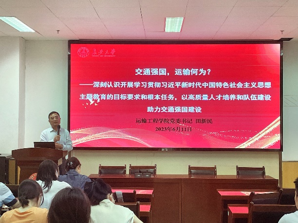活动第一阶段,田新民书记以《交通强国,运输何为—深刻认识开展学习贯彻习近平新时代中国特色社会主义思想主题教育的目标要求和根本任务,以高质量人才培养和队伍建设助力交通强国建设》为题讲授主题教育专题党课,从主题教育的目标要求和根本任务、“六个必须坚持”、以高质量人才培养与队伍建设助力交通强国建设三个方面,强调了要深化学思践悟、抓好主题教育,把主题教育做得更扎实、更深入、更有成效,要深刻领会习近平总书记关于人才观的新思想、新战略、新目标、新要求,充分认识双一流建设大学的新形势、新挑战和新使命,教工党员要进一步加强师德师风建设,学生党员要志存高远、脚踏实地,练就过硬本领,投身交通强国建设伟业。