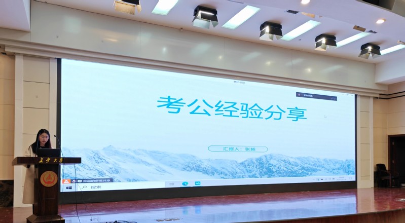 张越同学首先介绍了公务员和选调生备考的基本信息,分享了考试内容、招考条件以及信息获取途径,建议同学们养成多做多练、自我总结的备考习惯,并就近期工作分享自身体会与心得,希望同学们永葆初心,不懈奋斗。