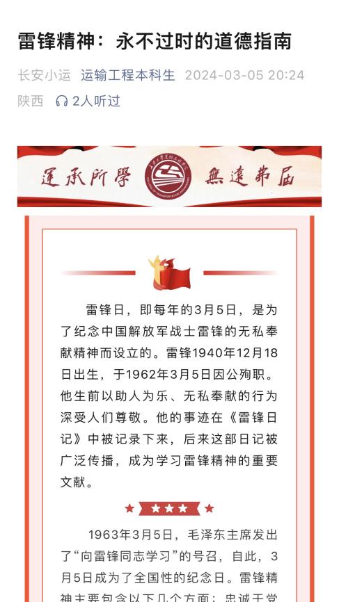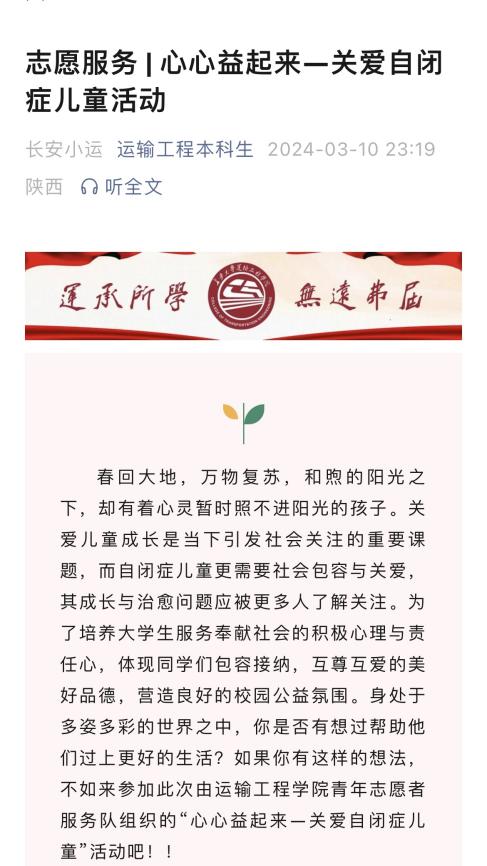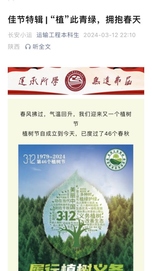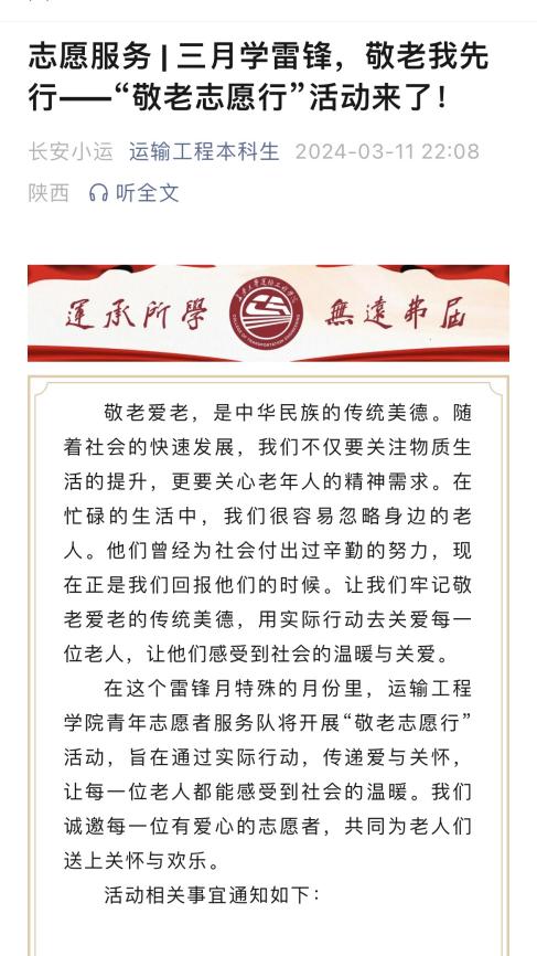 美高梅娱乐城 牢牢把握网络思政教育阵地,在两会、学雷锋日、植树节等重要时间节点,“运输工程本科生”公众号推出“学两会”、“佳节特辑—植树节”特色栏目,并围绕“学雷锋月”志愿服务活动安排,开展“敬老志愿行”、“心心益起来”志愿服务招募活动,润物无声地将社会主义核心价值观、大学精神、科学成才观浸润到学生心田,引导学生厚植家国情怀、将小我融入大我,不断践行强国有我的成才目标。