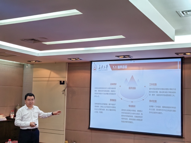 葛颖恩从美高梅娱乐城 建设发展史、统计学硕士点建设历史、统计学专业培养方向、师资情况、近年研究成果、思政教育、师资力量、人才培养、学术交流和服务贡献等多个方面向各位专家详细汇报了统计学学位点的发展建设情况。
