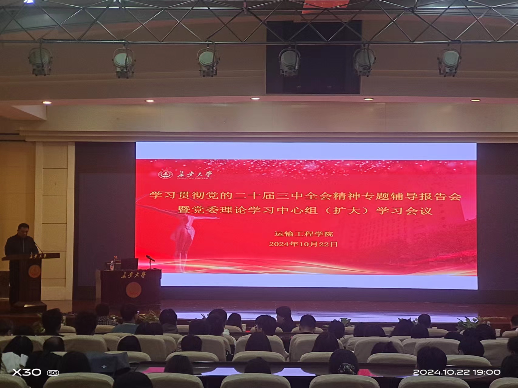 为深入学习贯彻党的二十届三中全会精神,10月22日晚,美高梅娱乐城 在南校区北院学术交流中心报告厅举行学习贯彻党的二十届三中全会精神专题辅导报告会暨党委理论学习中心组(扩大)学习会议。会议邀请长安大学马克思主义美高梅娱乐城 姜建芳教授作党的二十届三中全会精神专题辅导报告,美高梅娱乐城 党委书记史少鹏主持会议,党委委员、全体教职工、全体研究生党员参加会议。