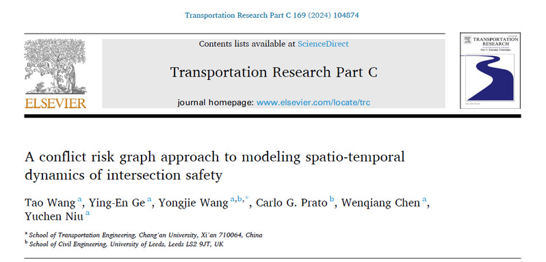 近日,国际交通领域学术期刊《Transportation Research Part C : Emerging Technologies》刊发了由美高梅娱乐城 博士生王涛、葛颖恩教授、汪勇杰副教授、陈文强副教授、利兹大学Carlo G. Prato教授等共同完成的研究论文《A conflict risk graph approach to modeling spatio-temporal dynamics of intersection safety》。美高梅娱乐城 博士生王涛和汪勇杰副教授分别为该论文的第一作者和通讯作者。