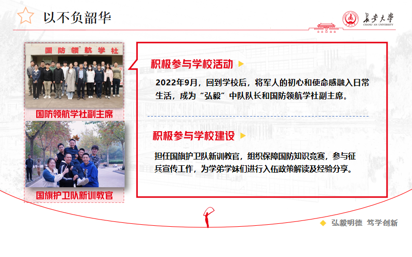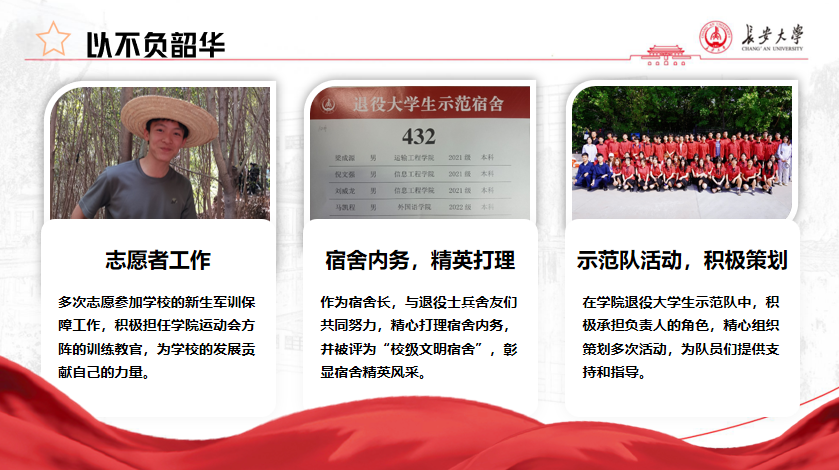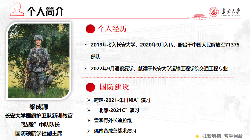 梁成源,男,壮族,美高梅娱乐城 交通工程专业2021级本科生。2020年参军入伍,服役于中国人民解放军71375部队。在部队担任工程兵爆破手、装甲车车长、新闻报道员等身份,五次参与爆破作业,并负责连队生活及训练的记录报道工作,因表现良好,被选派往集团军军官集训队新闻报道小组,在战区宣传平台上参与写作发表三篇新闻报道。两年坚守在祖国北疆,保家卫国,坚守使命。服役期间梁成源参加“跨越-2021·朱日和A”演习、“北部·2021C”演习、雪季野外长途拉练、洮南合成营战术演习等大型军事任务,荣获“四有”优秀士兵荣誉1次、旅级嘉奖1次。2022年退役复学后担任长安大学国旗护卫队新训教官、“弘毅”中队队长、国防领航学社副主席等职务。