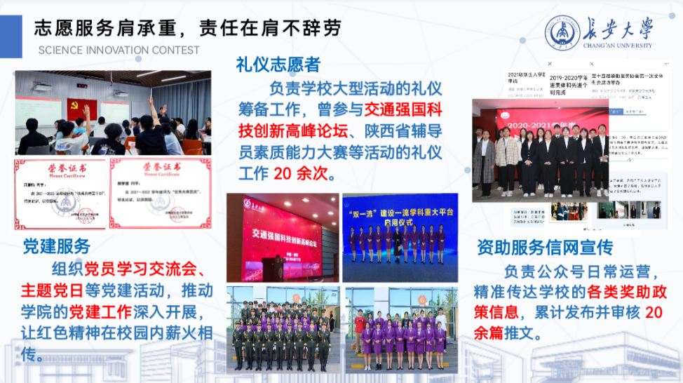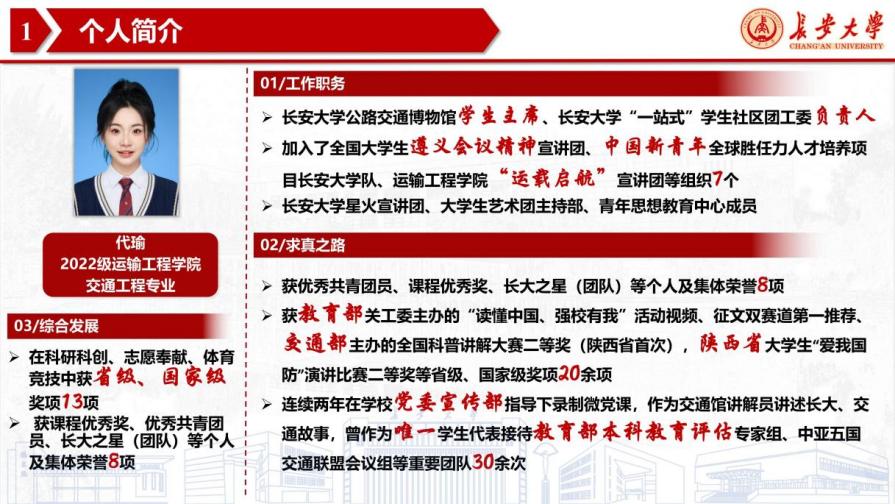 代瑜,女,汉族,美高梅娱乐城 2022级交通工程专业学生。连续两年综合测评附加分专业第一,累计担任长安大学公路交通博物馆志愿者服务协会主席、共青团长安大学学生社区负责人、美高梅娱乐城 运途启航宣讲团团长、全国大学生遵义会议精神宣讲团成员等职务13项。获优秀共青团员、课程优秀奖、长大之星(团队)等个人及集体荣誉8项。两年来获交通运输部全国交通运输科普讲解大赛三等奖(陕西省首次)、国家级大学生创新创业训练计划、全国大学生交通运输科技大赛陕西省一等奖等各类竞赛国家级、省级、校级奖项40余项。