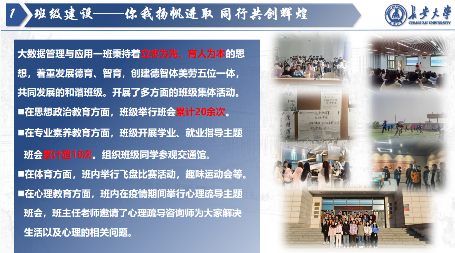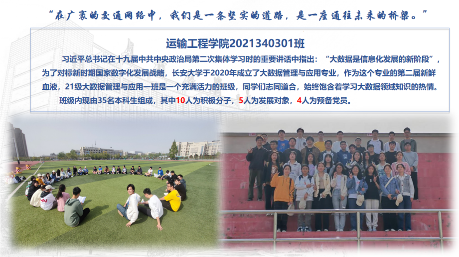 美高梅娱乐城 2021340301班,由35名本科生组成,是一个充满活力与激情的集体。班级英语四级通过率100%,六级通过率68.6%,保研率达20%。在学术科研、志愿服务、校园文化等方面表现优异,累计获奖学金49人次,科研竞赛奖项51项。班级秉持立志为先、育人为本,开展多方面集体活动,展望未来,将继续勇于探索,不断创新,为国家发展贡献力量。