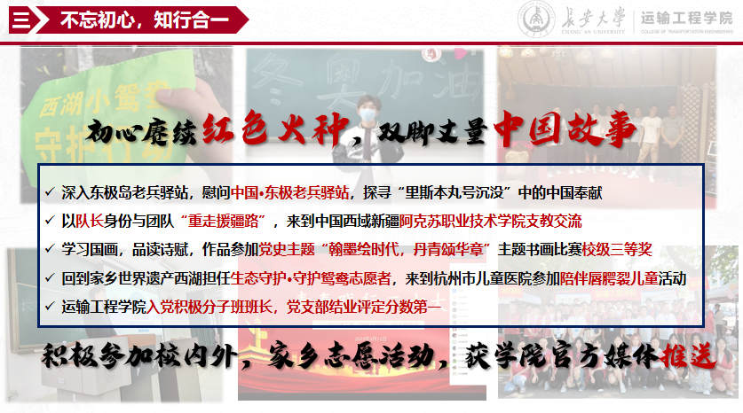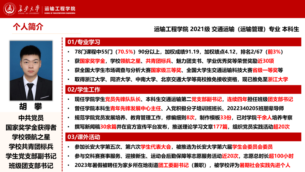 胡攀,男,中共党员,美高梅娱乐城 2021级交通运输(运输管理)专业本科生。入校以来,担任美高梅娱乐城 学生党员先锋队队长、本科生交通运输第二党支部副书记、美高梅娱乐城 本科生青年先锋发展中心主任、班级团支部书记等职务,被选为美高梅娱乐城 第六届学生会委员会委员。本科期间,获国家奖学金、长大·卓越奖·领航之星、美高梅娱乐城 共青团标兵、魅力团支书、学业优秀奖、校园贡献奖等荣誉奖励30余项,带领所在班级获美高梅娱乐城 文明班集体、五四红旗团支部、活力团支部等荣誉。现已推免至浙江大学。