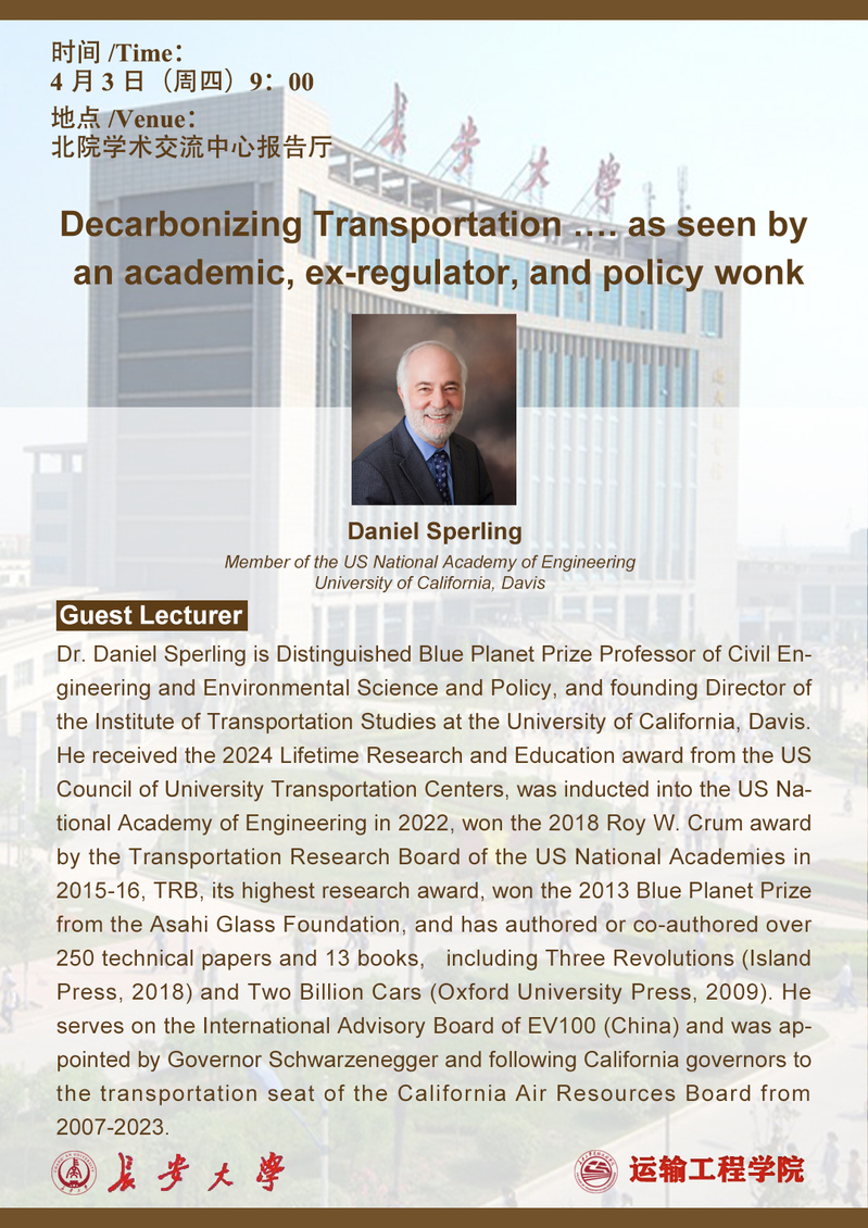 The School of Transportation Engineering cordially invites Professor Daniel Sperling, a member of the U.S. National Academy of Engineering and Director of the Institute of Transportation Studies at the University of California, Davis, to visit our university for exchange and guidance. All faculty and students are warmly welcome to attend.