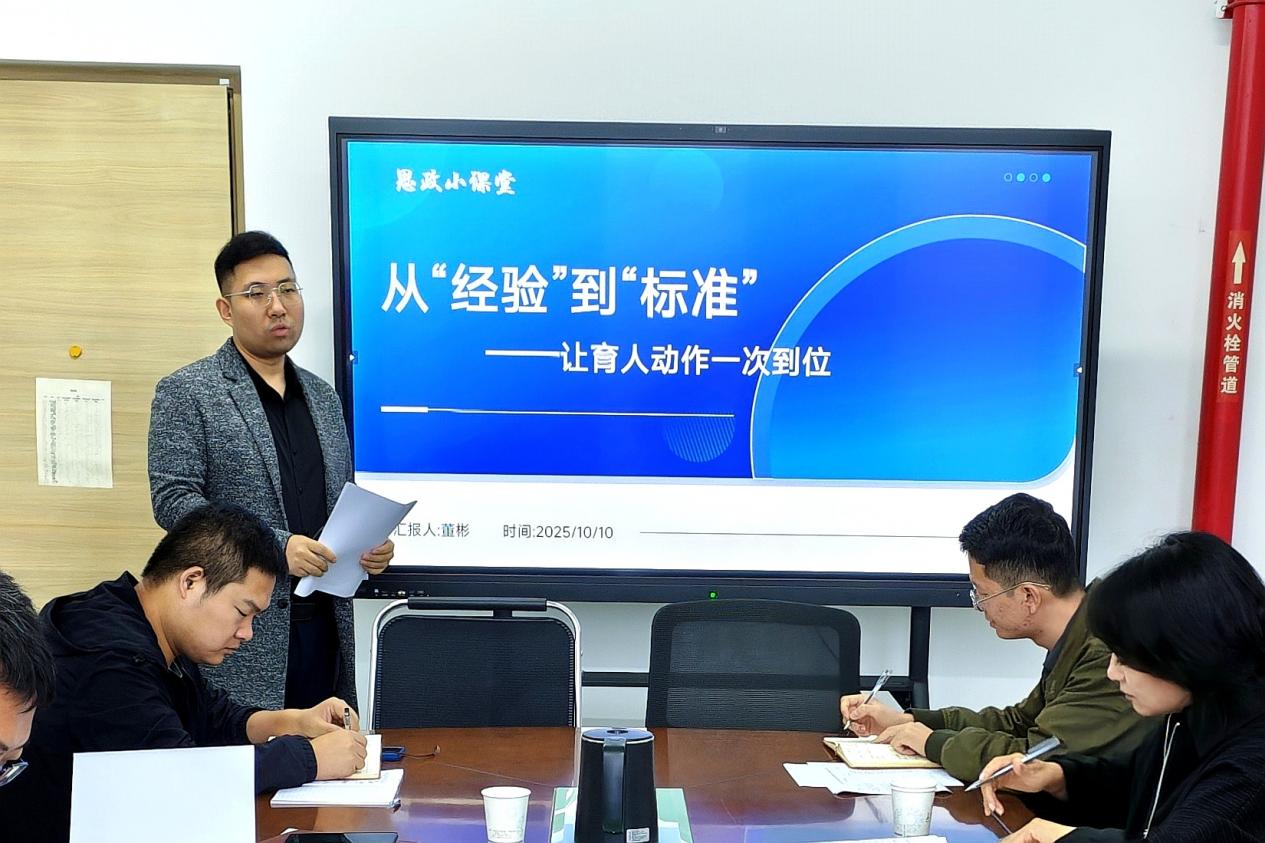 李婷指出,《标准》的学习不仅是“知规范、明职责”的过程,更是“强能力、提质效”的契机。要将《标准》内容与工作实际紧密结合,梳理工作清单,补齐能力短板,切实把“立德树人”根本任务融入日常、抓在经常。学生工作办公室主任董彬以“从‘经验’到‘标准’——让育人动作一次到位”为主题领学了文件内容,从政策背景与实施目标、工作内容与量化标准、制度落实与考核机制等方面出发,学习了辅导员日常工作的“责任清单”与“操作规范”,全体辅导员围绕《标准》内容结合实际工作中遇到的问题展开了交流。