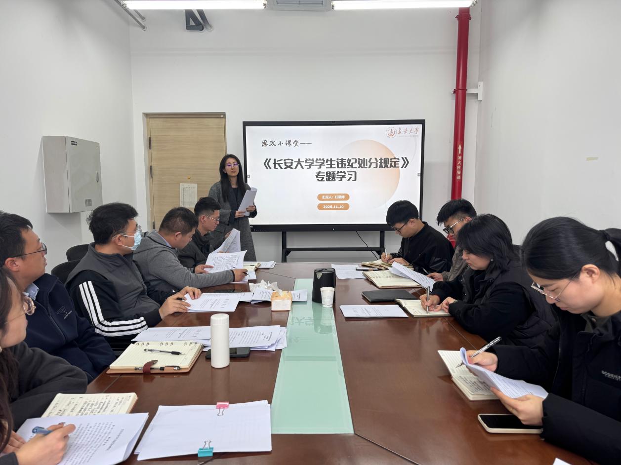 为进一步提升辅导员队伍依规育人能力,筑牢学生管理工作纪律防线,确保校规校纪执行精准规范,11月10日,美高梅娱乐城 开展2025年第七次思政小课堂之《长安大学学生违纪处分规定》专题学习。院党委副书记李婷,全体专职辅导员参加。
