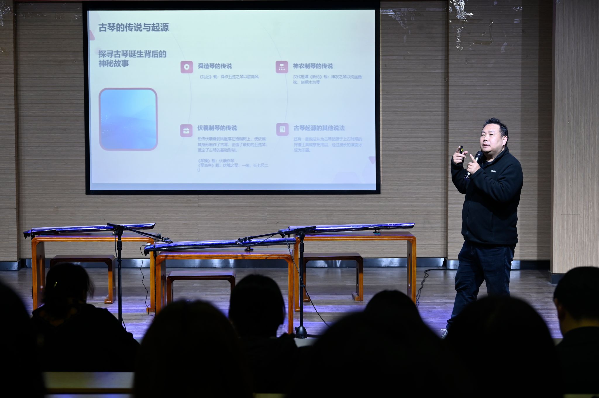 举办齐鲁音乐文化讲坛的目的。他提到增强文化自信、传承中华文化的重要性,强调古琴作为传统乐器承载着深厚的历史文化,希望同学们加深对古琴艺术的理解,体验其艺术魅力,增强对传统文化的认同感和自豪感。