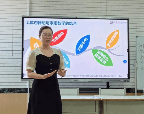 音乐歌唱教学中“技巧与情感失衡”的核心痛点。孙人君老师深入解析了达尔克罗兹教学法(以钢琴即兴、体态律动和视唱练耳为支柱),强调其旨在发展学习者的运动觉、内心听觉和即兴能力。她指出,“体态律动”是关键桥梁,将抽象音乐转化为可视肢体语言。结合专家观点(吴天球、高建进),孙老师阐明律动不仅是提升气息、发声等技巧的“技术辅助”,更是至关重要的“情感补充”,能帮助学生通过身体响应节奏、力度和旋律,深刻内化情感,实现技巧与表达的有机统一。讲座通过拆解体态律动在歌唱教学中的具体应用方面,为音乐师范生提供了极具操作性的方法论,破解其未来教学实践中“如何兼顾技巧与情感”的核心难题,有效提升其歌唱教学效能。
