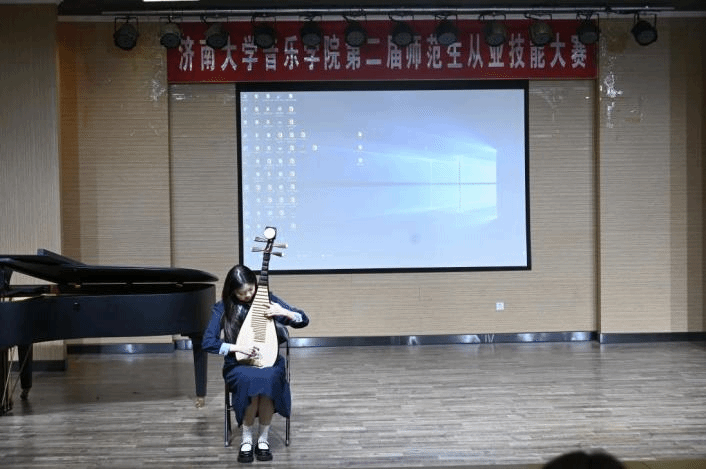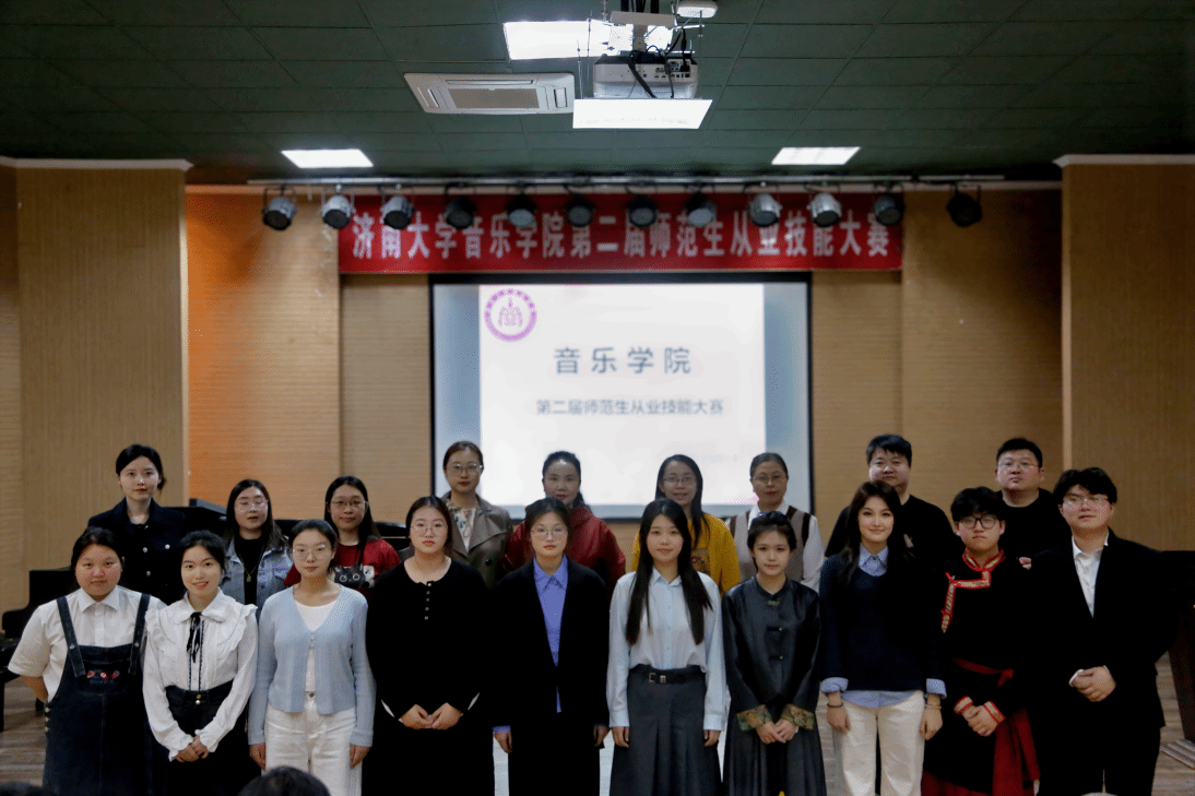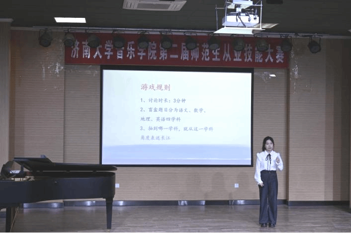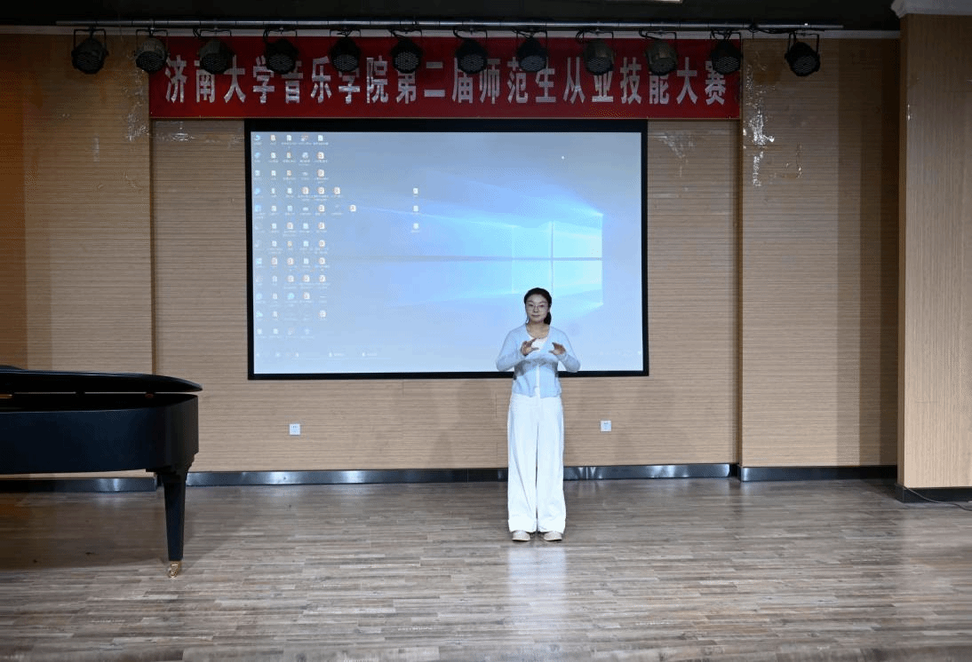 比赛环节严格遵循《山东省师范类高校学生从业技能大赛》流程,围绕声乐(或钢琴)、器乐(或舞蹈)、合唱指挥、自弹自唱、微课展示、钢笔字、现场提问七大核心模块展开,全面考察选手专业技能与教育教学基础能力。其中,微课课题均选自人音版中学音乐教材,紧密贴合师范专业人才培养方案及毕业要求,凸显 “教—学—用” 一体化导向。