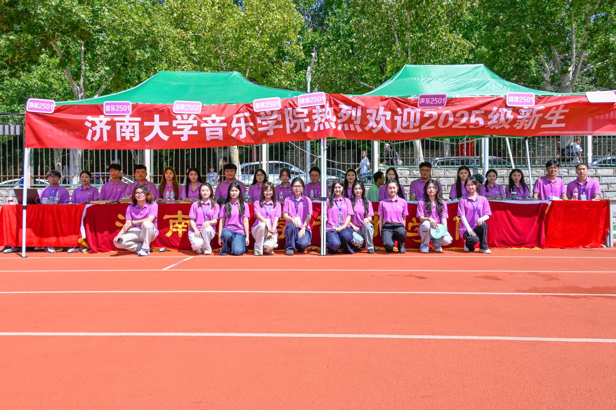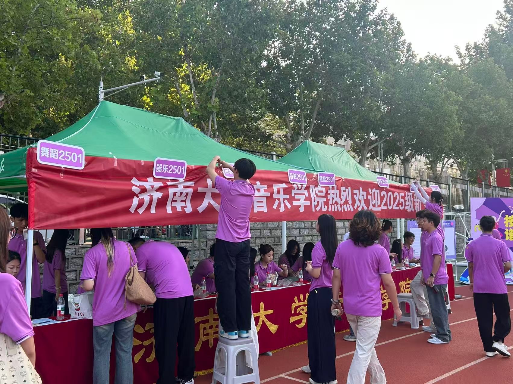 的迎新点已热闹起来:红色的引导牌整齐排列,志愿者们提前调试好登记设备,桌上的新生手册、校园地图与定制扇子码放得满满当当。七点刚过,第一批新生便带着朝气走来,有的背着琴包、有的提着乐谱架,眼神里满是对新环境的好奇与向往。