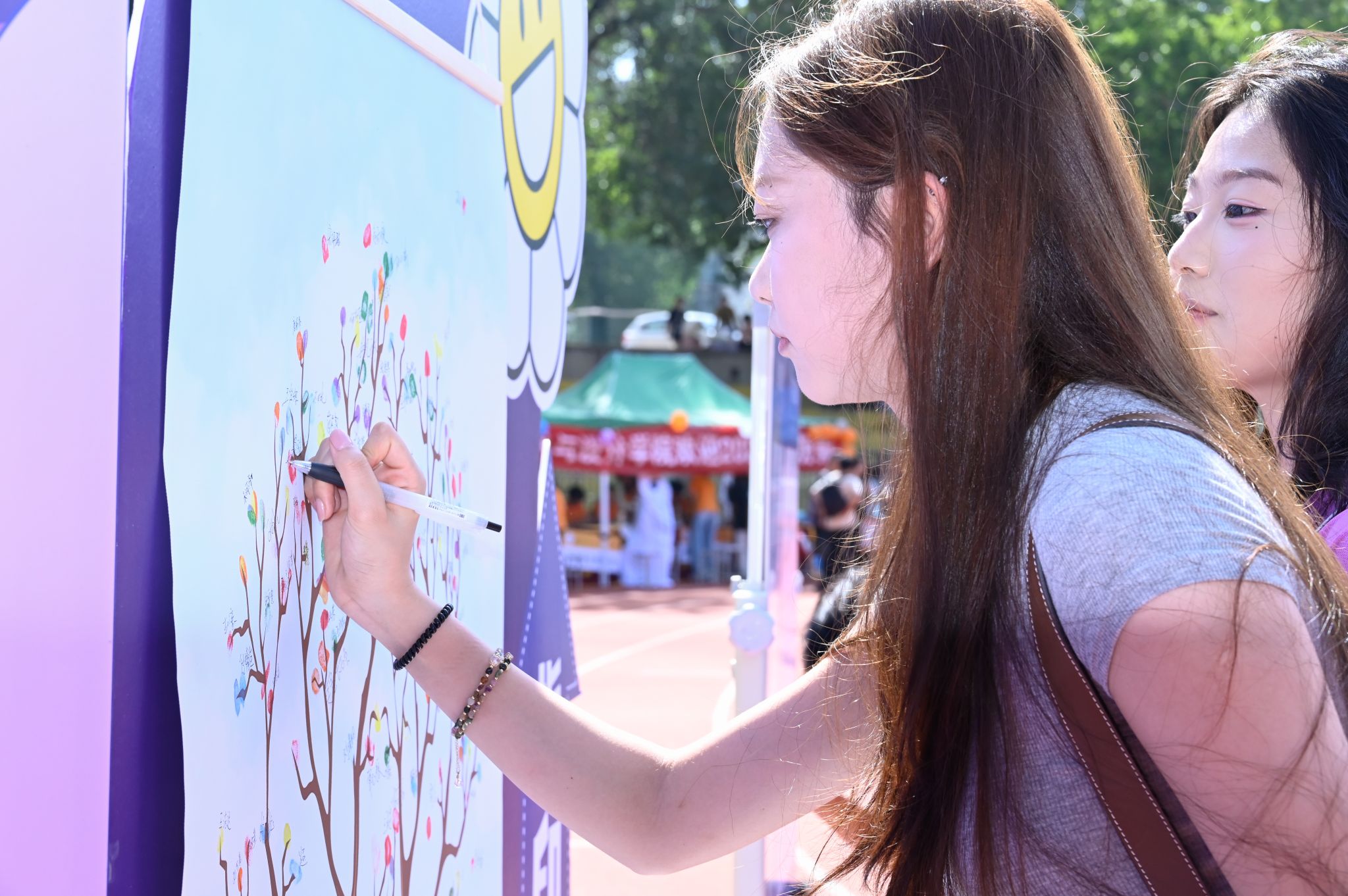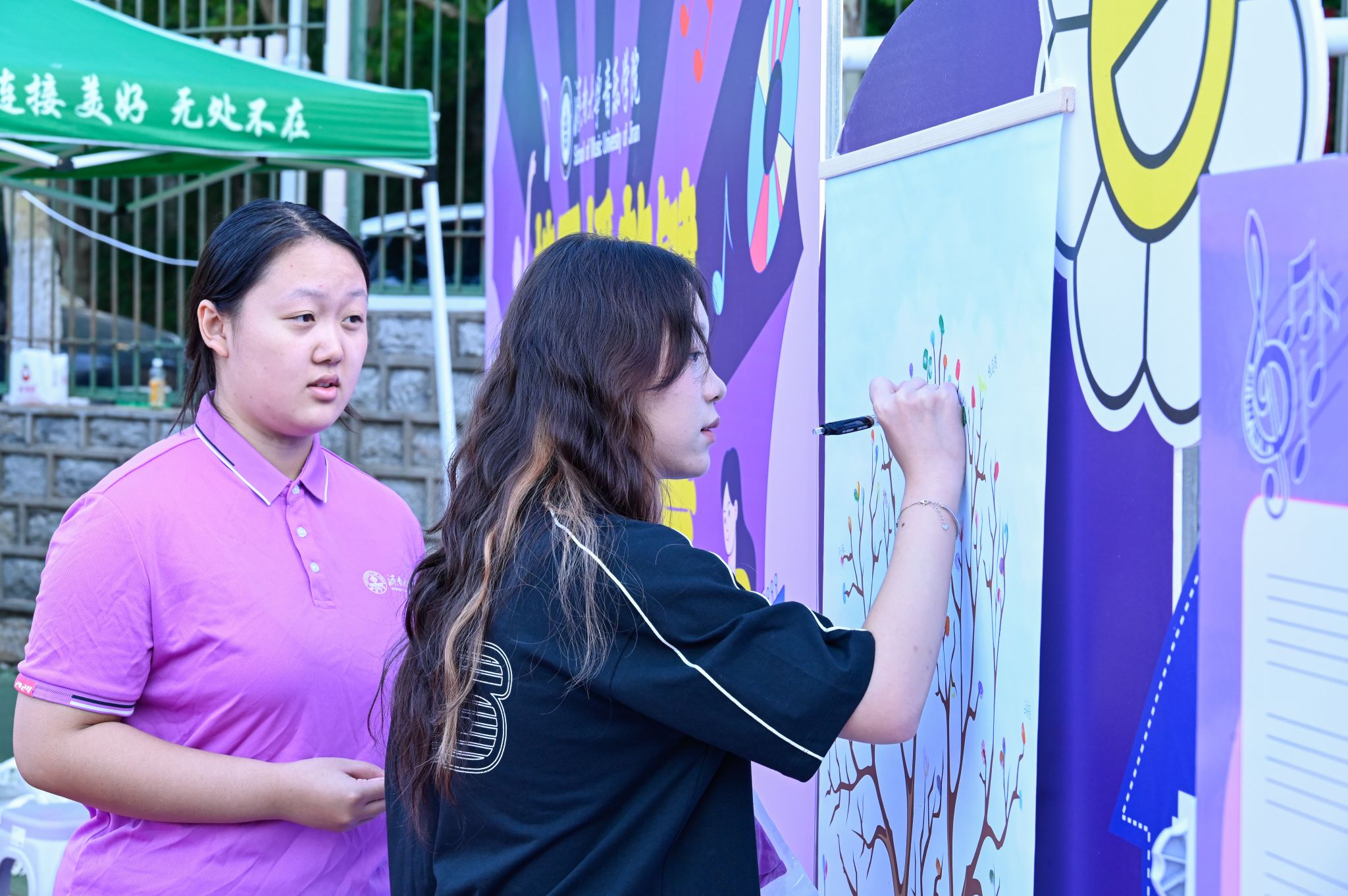 打造“指印·时光交响树”互动艺术装置,志愿者们热情引导,新生用彩色手印点缀枝丫,并写下第一段大学乐谱,共同创作属于2025级的音乐之树。