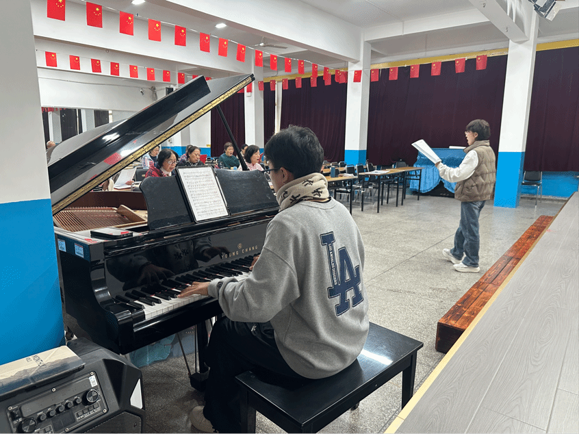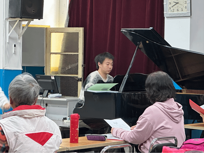 学生柏淇舜与李安珂受邀前往校离退休处,为退休教师合唱团担任钢琴伴奏。用悠扬琴声为退休教师们的合唱时光增添温情,既践行了敬老爱老的传统美德,也让学子在实践中传递音乐的温暖力量。