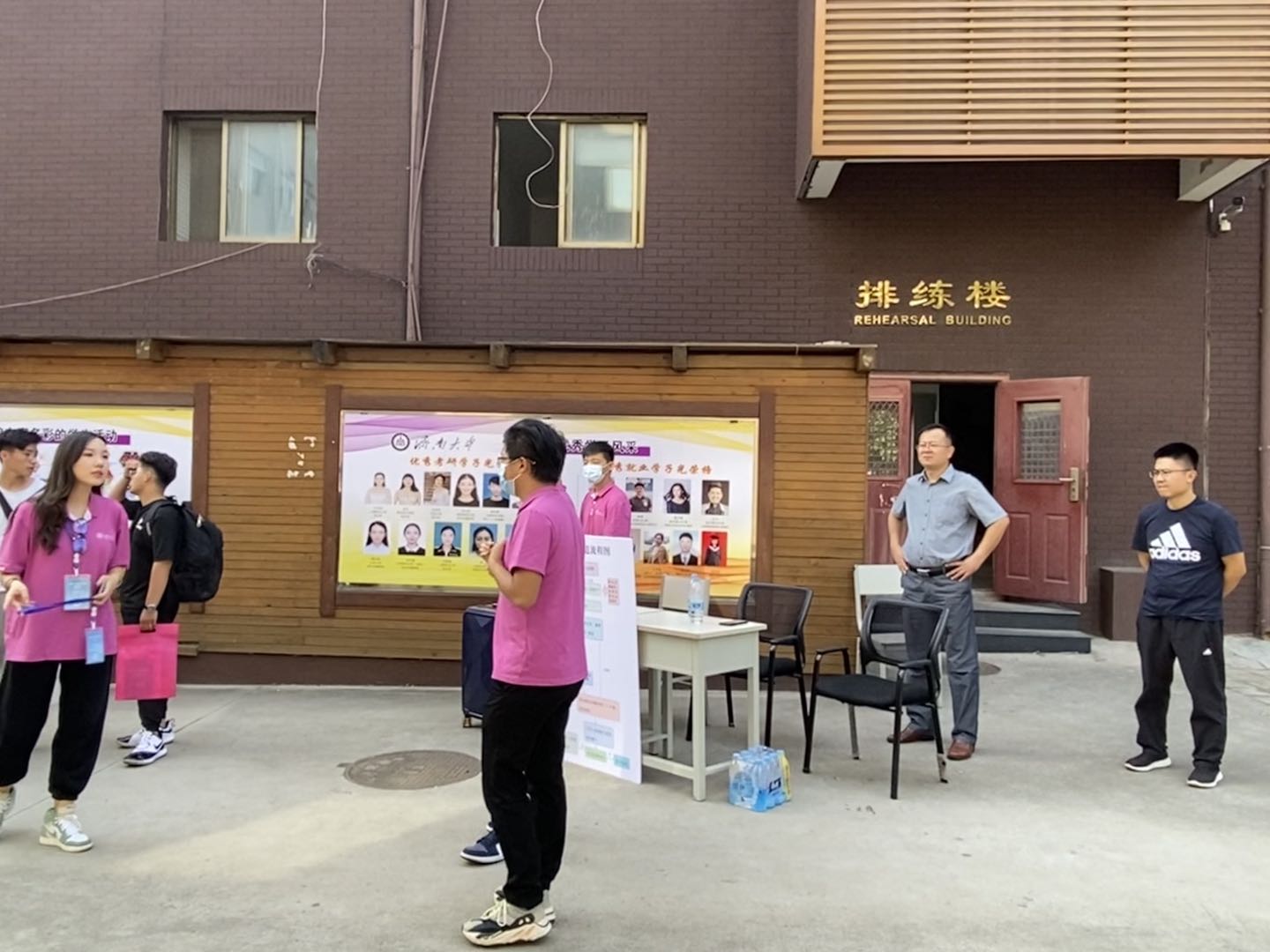 领导在迎新现场与前来报到的2020级新生亲切交流并慰问现场工作人员与志愿者。