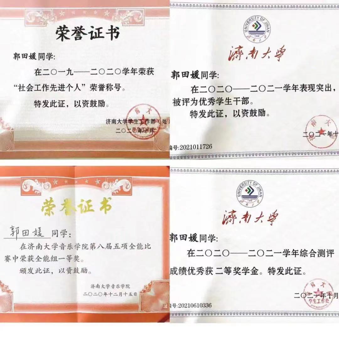 三等奖学金、社会工作先进个人,五项全能综合一等奖、声乐单项二等奖、微课二等奖、钢琴伴奏二等奖、器乐演奏三等奖、钢琴演奏三等奖