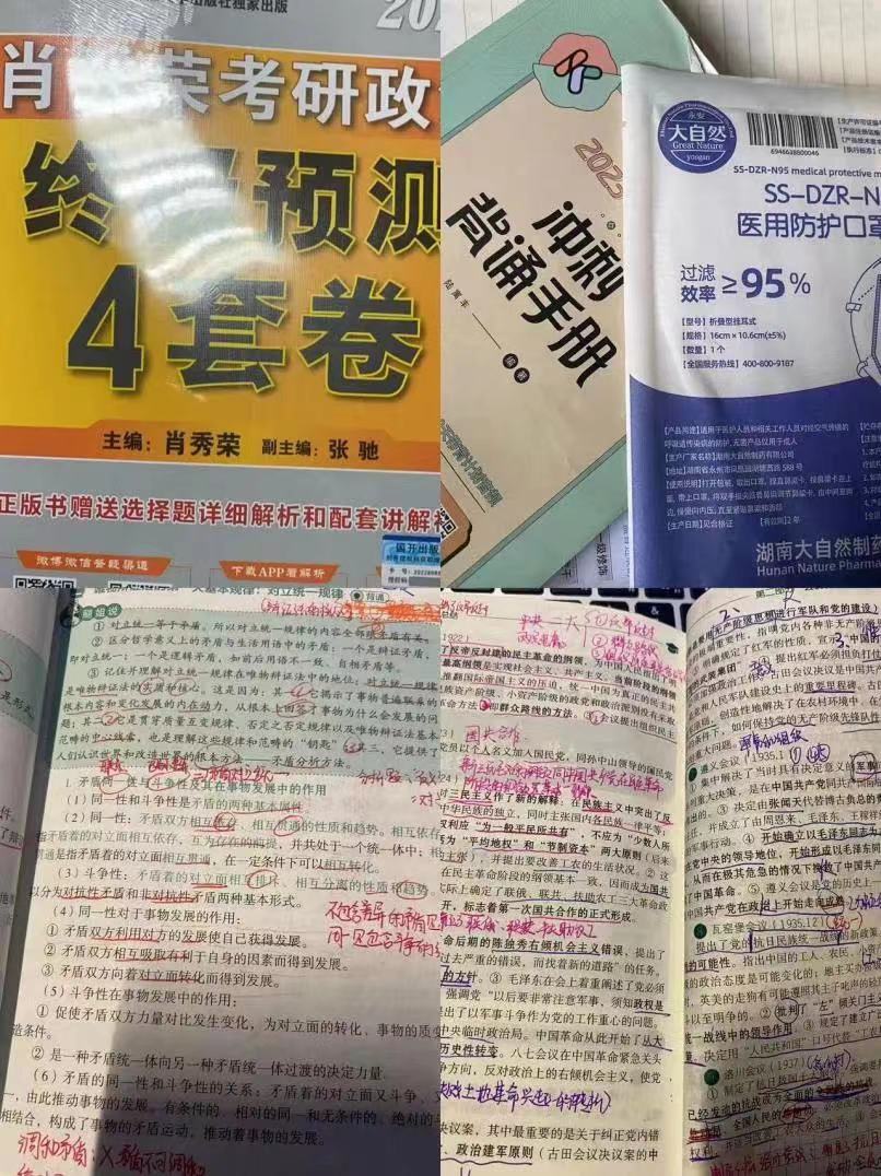 政治的学习我开始的相对较晚一些,差不多在七月底八月初。我听的是徐涛老师的课程,随后开始学习肖秀荣老师的1000题。在此期间还背诵着徐涛老师的小手册。在后期学习的肖秀荣四套卷、肖秀荣八套卷,进行了背诵。