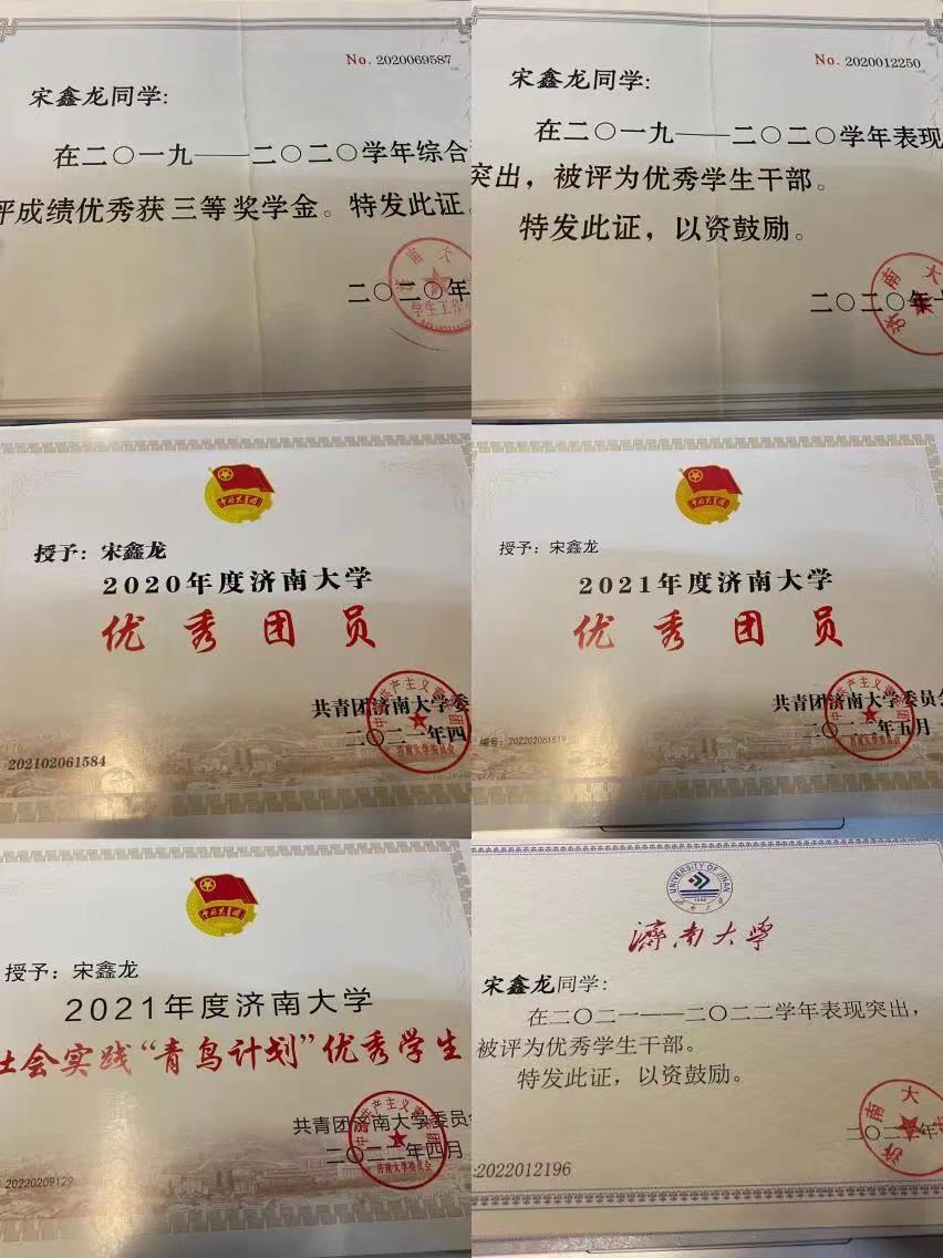 二等奖学金、优秀学生干部、五项全能综合一等奖、山东省第六届大学生艺术展演活动一等奖