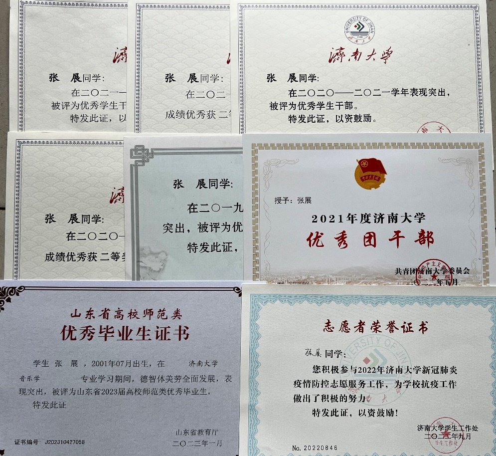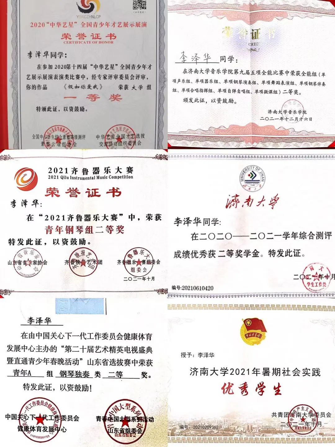 优秀学生干部、山东省大学生合唱艺术节一等奖、齐鲁器乐大赛青年钢琴组二等奖、美高梅娱乐城
