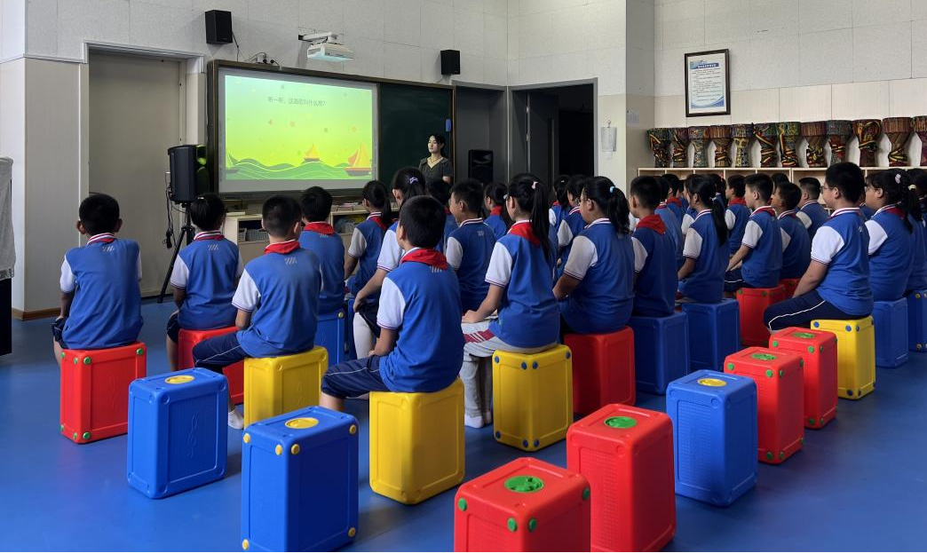 学生建立在基础理论的学习之上,进入一线教学环境进行的教学实践,共安排了两节课进行教学。第一节课由器乐2001班张亭亭同学进行五年级课程《外婆的澎湖湾》的讲解,在教学过程中充分运用了在音乐教育学课上学到的“多觉联动”教学方法,发挥动觉、听觉、视觉等多方面的联动效应,使五年级的学生们沉浸在对台湾校园歌曲《外婆的澎湖湾》的学习中。不仅掌握了如何演唱该歌曲,进入了很好的歌唱状态,还通过课程中了解到了台湾澎湖列岛的风土人情。张亭亭同学在歌曲的教学中,让学生们自由想象歌曲中所展现的画面,并且在完成歌曲的教学后,张亭亭同学又带领大家了解了其他几首校园歌曲,向同学们讲述歌曲的演唱者与亲人之间感人的故事,使学生们在本堂课中受益匪浅。