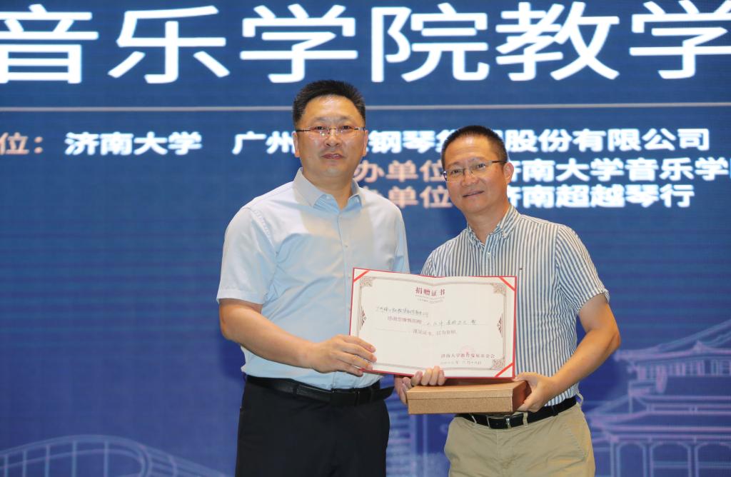 合作发展处处长、教育发展基金会办公室主任卢旺为广州珠江钢琴集团股份有限公司颁授捐赠证书和纪念品。美高梅娱乐城