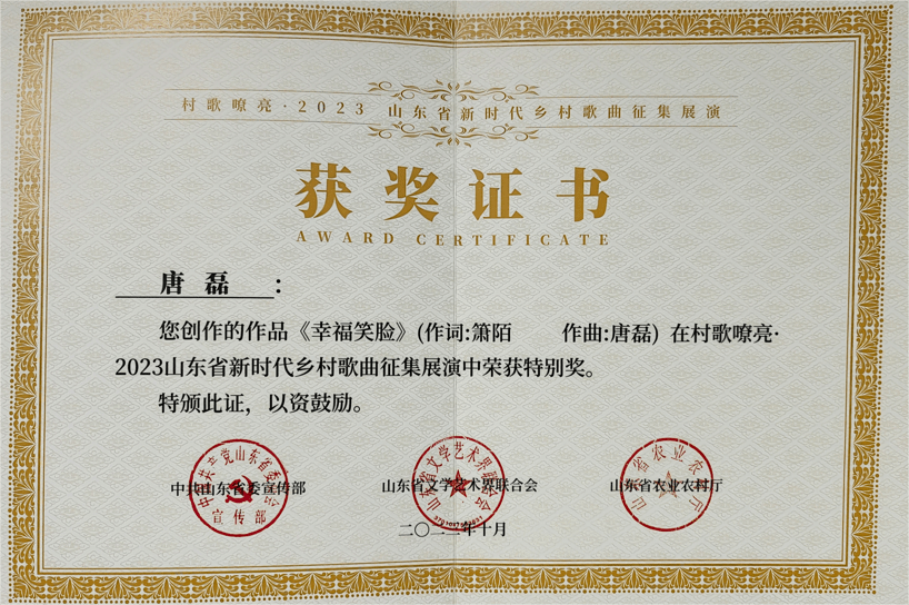 近日,在由中共山东省委宣传部,山东省山东省文学市术联合会,山东省农业农村厅举办的村歌嘹亮·2023山东省新时代乡村歌曲征集展演中,由箫陌作词、美高梅娱乐城