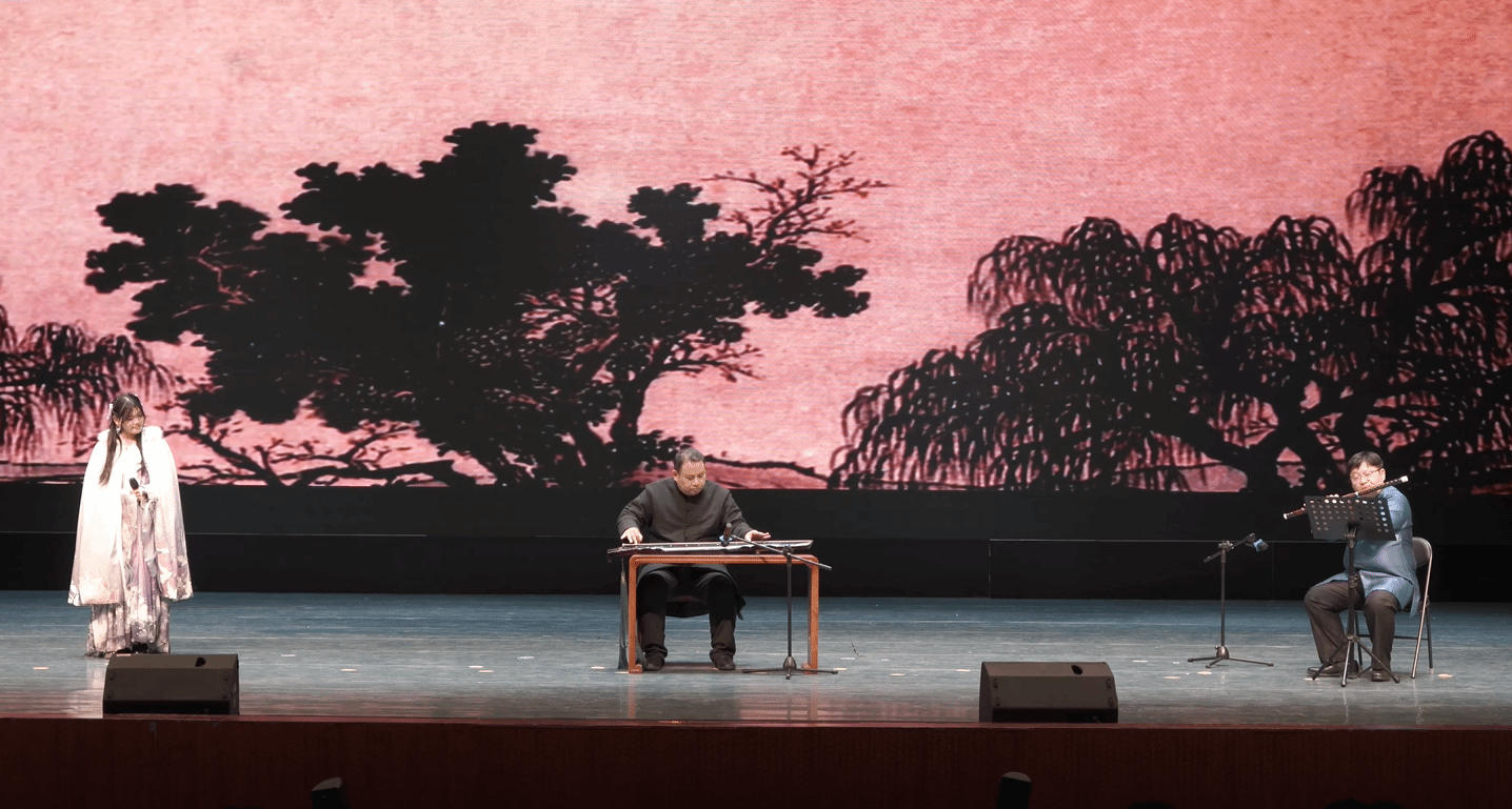 舞蹈系学生秦传睿携手合作,将古琴与舞蹈艺术巧妙融合,在《酒狂》的旋律中,秦传睿以灵动的舞姿诠释着曲中意境,展现了古琴与舞蹈艺术融合所带来的独特韵味,为观众呈现了一场视听双重享受的艺术盛宴;而由李科(琴)、李展(笛)、修缮 2301 班学生熊舒娴(唱)共同演绎的《阳关三叠》,则以其深情的演唱和精湛的演奏,赢得了观众的阵阵掌声,成为整场演出的又一大看点。同时,《平沙落雁》的悠扬、《普庵咒》的庄严、《梅花三弄》的刚柔并济等曲目,也以其独特的艺术魅力,让观众沉浸在音乐的海洋中,深切感受到古琴艺术的深厚底蕴。