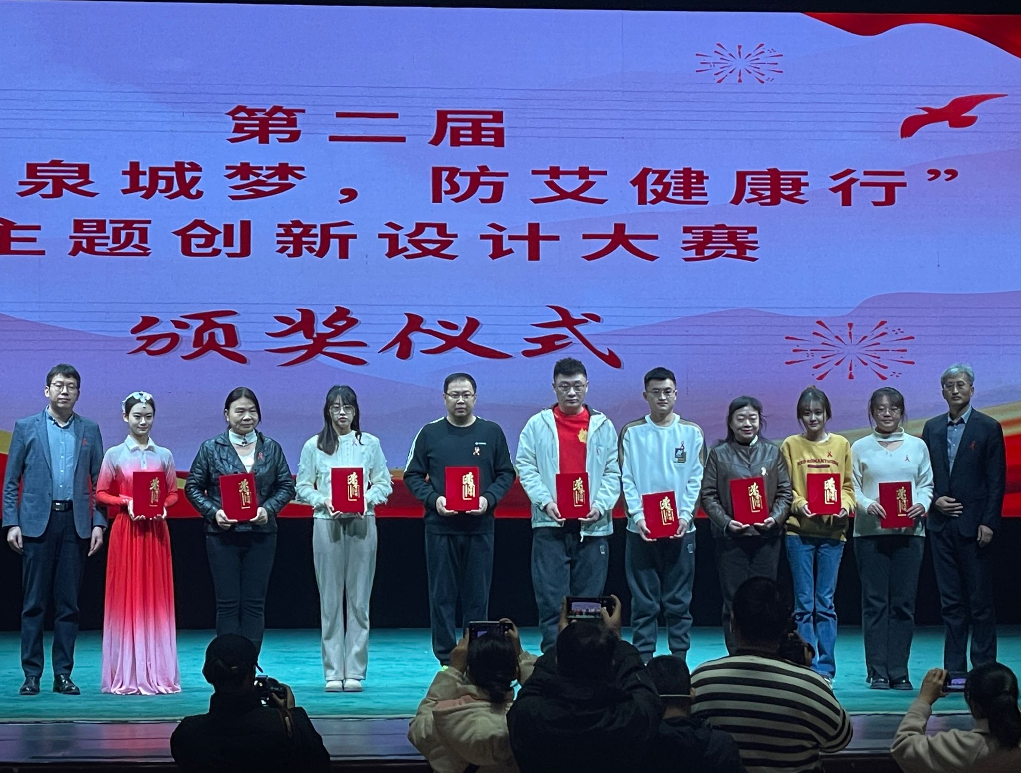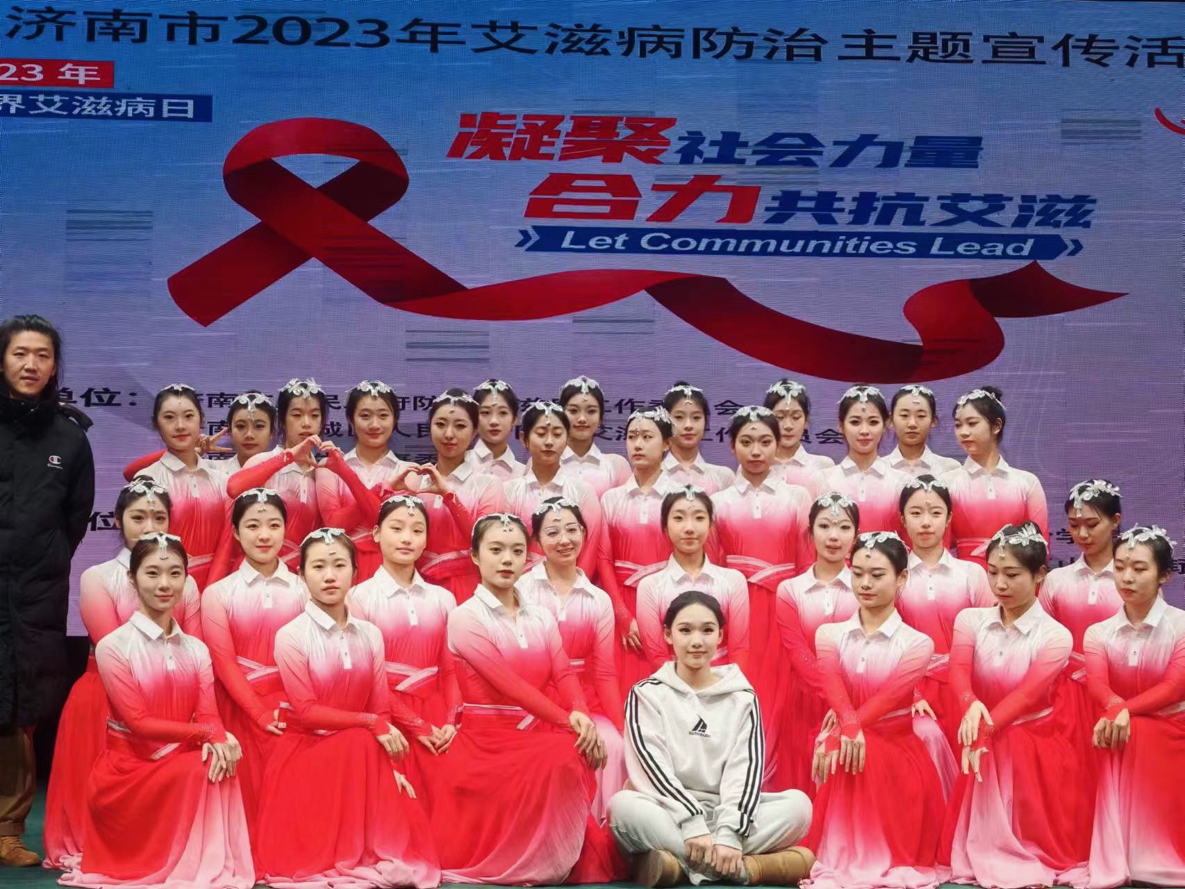 "爱你的人,就叫红丝带",随着音乐响起,舞台灯光倾泻而下,柔和的光芒包裹着起舞的少女们,轻捷地脚步不停旋转,红白的舞裙飘摇曳曳,领舞手中的红丝带随着衣袖的甩开,飘飘荡荡凌空而下,抒发着对艾滋病人的关爱与支持。