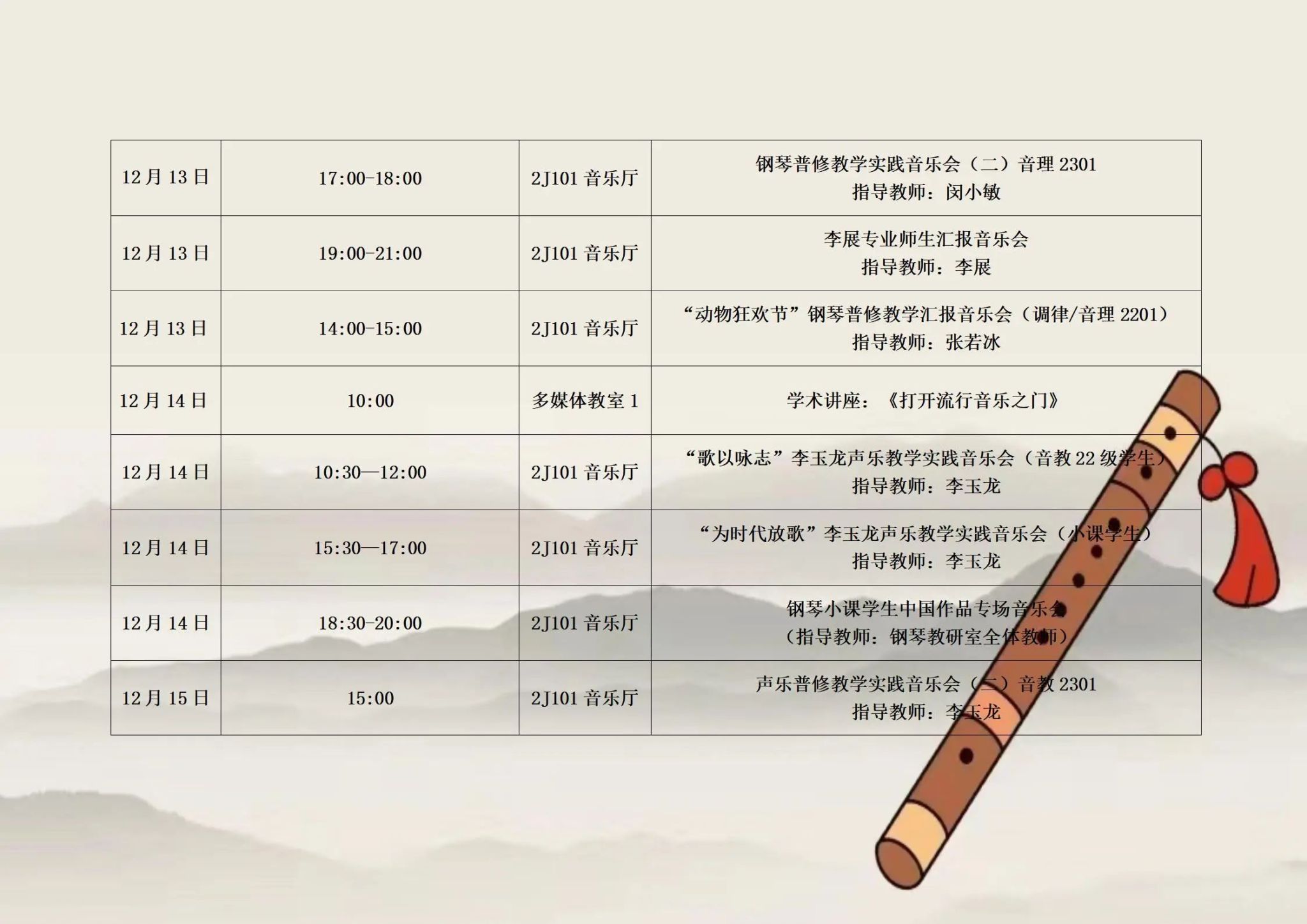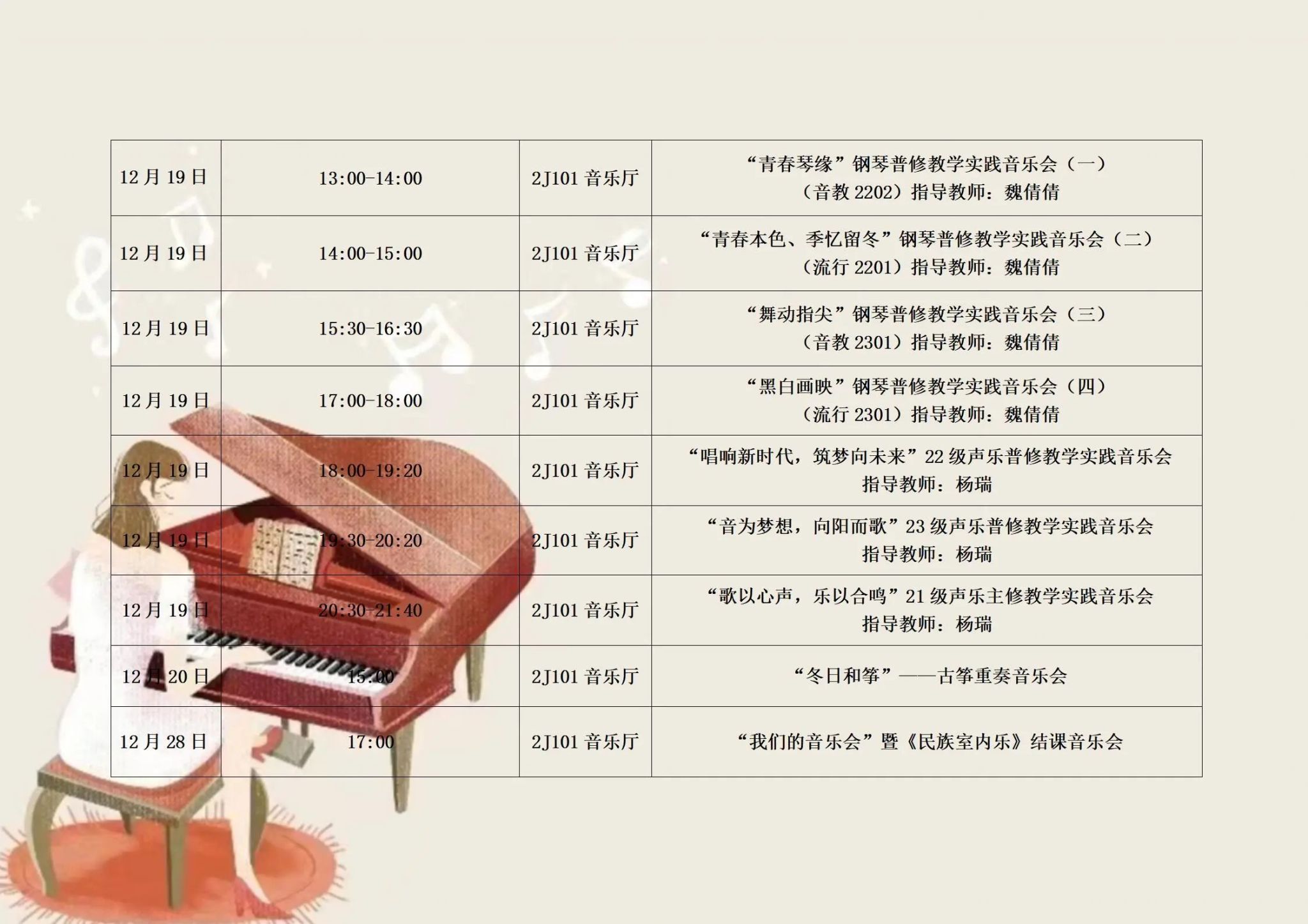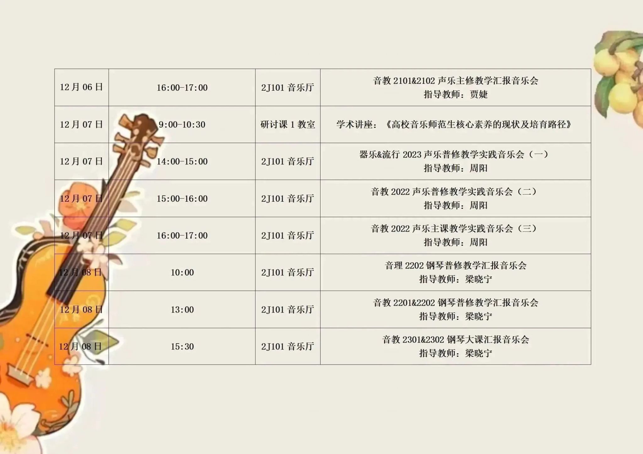 于2023年12月启动艺术实践周系列活动。培养既有教学技能⼜有音乐表演能⼒的应⽤型⼈才是⾳乐学专业的重要方向,艺术实践周拟通过多⻆度、多形式的开展艺术实践,以“⼀专多能”为⼈才培养的核⼼,提⾼学⽣教学技能、音乐表演、艺术理论与技术以及⾼雅的审美能⼒ ,了解当下的美育开展现状与具体实施形式,开阔学⽣的知识视野,并使其艺术素养得到良好发展。(注:各项活动时间如有调整,以具体通知或海报为准。)