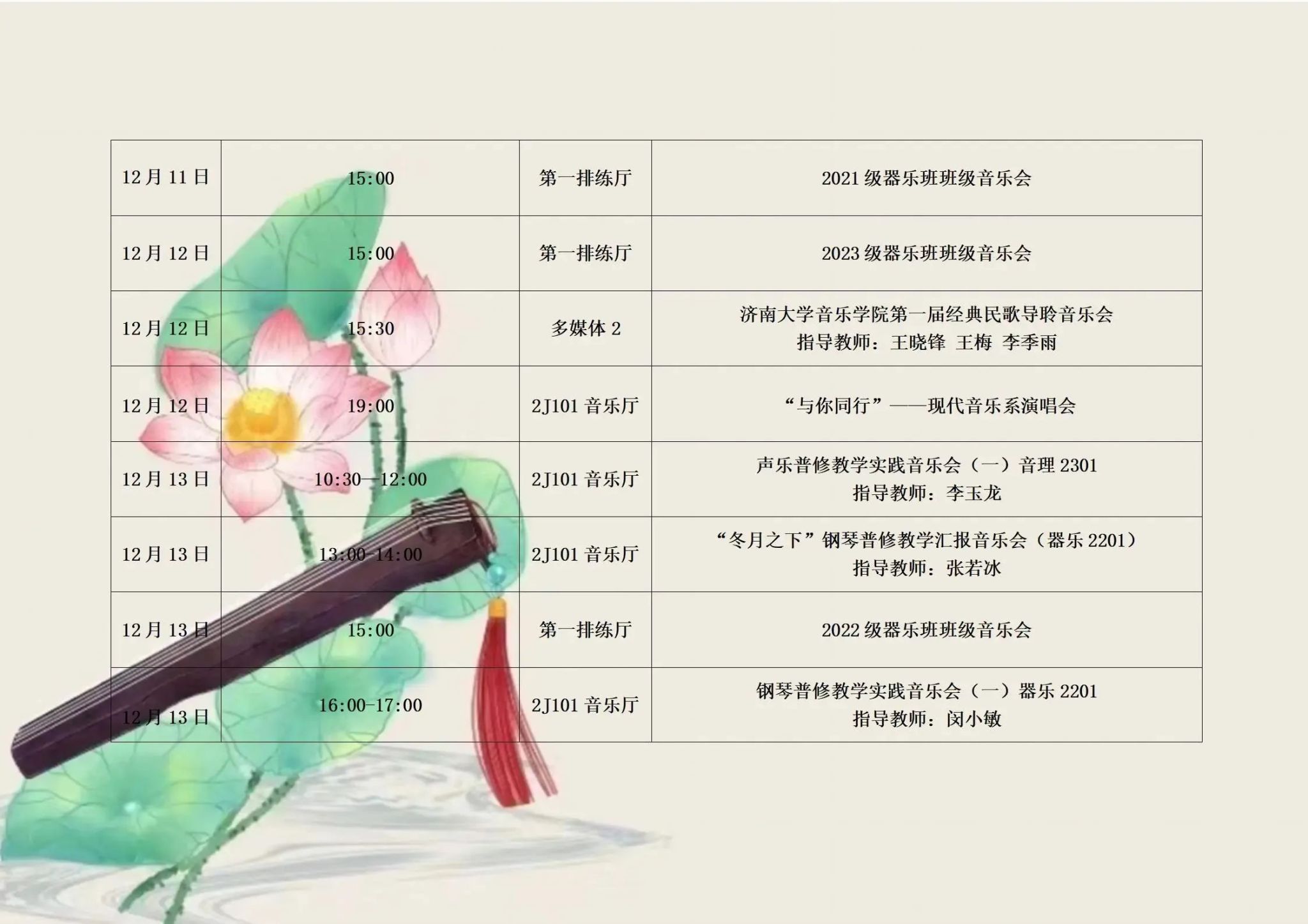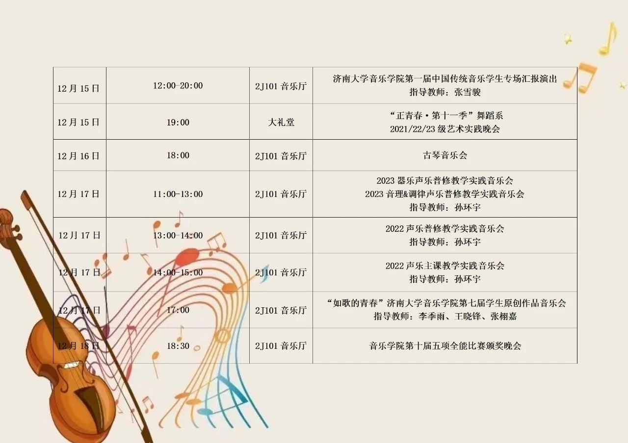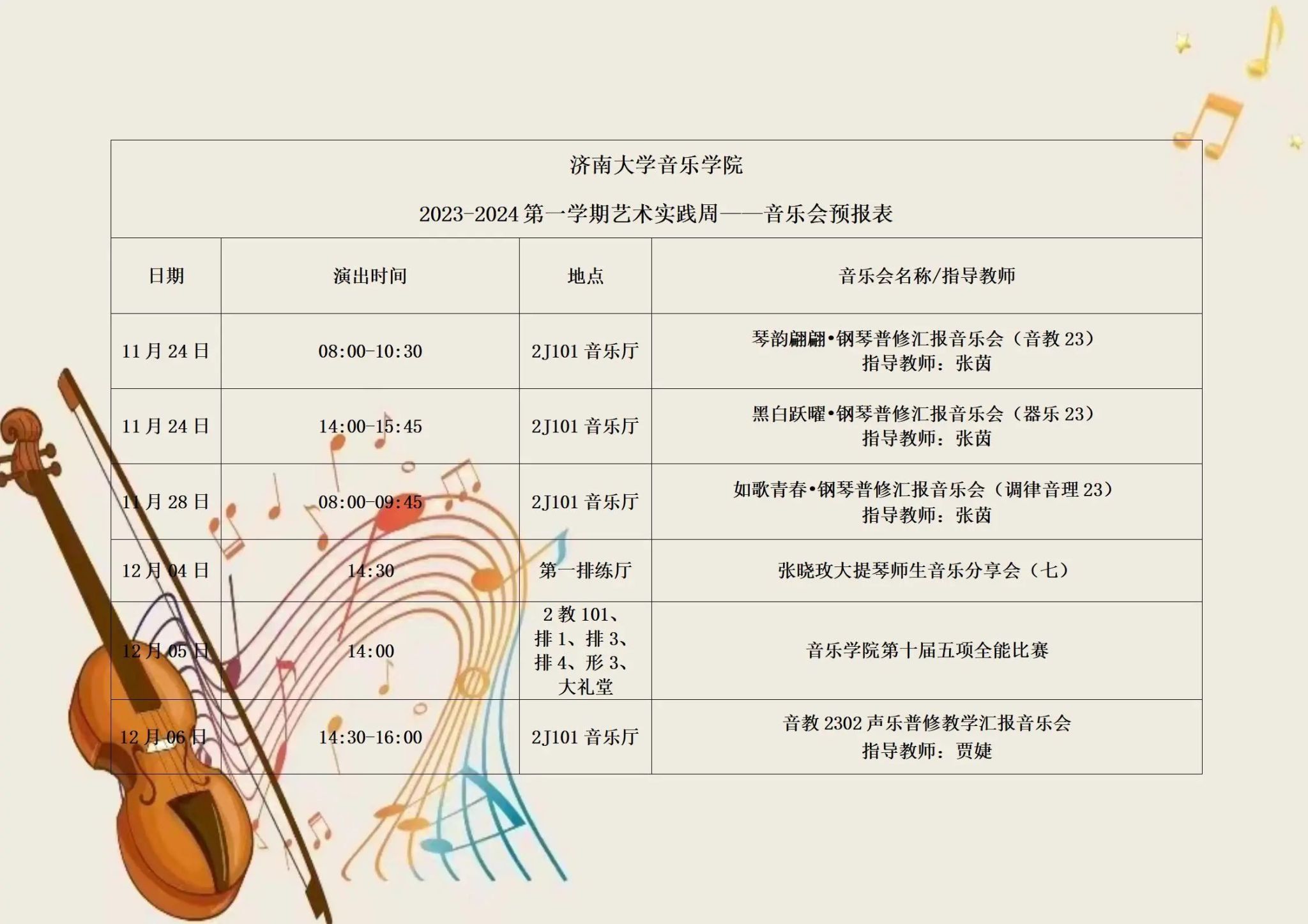 于2023年12月启动艺术实践周系列活动。培养既有教学技能⼜有音乐表演能⼒的应⽤型⼈才是⾳乐学专业的重要方向,艺术实践周拟通过多⻆度、多形式的开展艺术实践,以“⼀专多能”为⼈才培养的核⼼,提⾼学⽣教学技能、音乐表演、艺术理论与技术以及⾼雅的审美能⼒ ,了解当下的美育开展现状与具体实施形式,开阔学⽣的知识视野,并使其艺术素养得到良好发展。(注:各项活动时间如有调整,以具体通知或海报为准。)