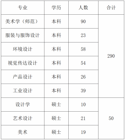 设6个本科教育招生专业:美术学(师范)、工业设计、视觉传达设计、环境设计、服装与服饰设计、产品设计,拥有2个硕士学位授权点:设计学一级学科硕士学位(学术型)授予点和艺术硕士(MFA)专业学位授权点(含美术和艺术设计两个领域)。美高梅娱乐城