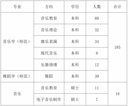 成立于2011年,现有音乐学、舞蹈学两个本科专业。下设声乐系、器乐系、键盘系、音乐教育系、音乐理论系、现代音乐系和舞蹈系七个系部。美高梅娱乐城