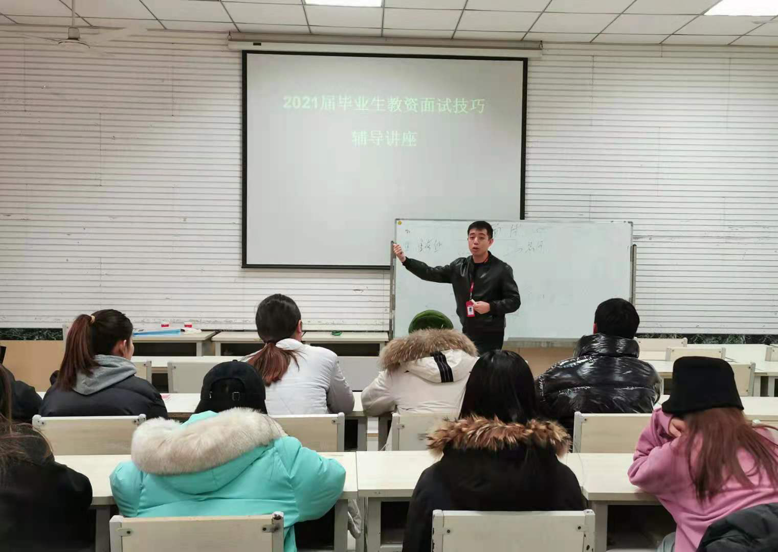 在第二多媒体教室举办了教师资格证面试技巧专题讲座。此次讲座邀请了中公教育教资培训师孙泽盛老师主讲,学办主任、毕业年级辅导员马媛老师主持,部分毕业生参加讲座。