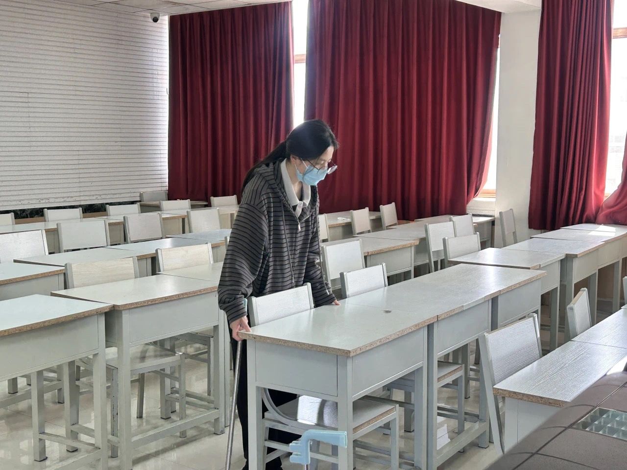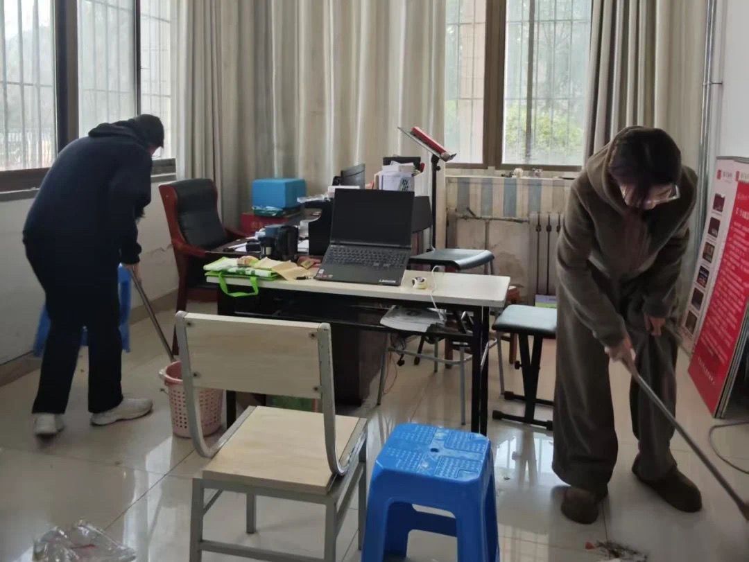 多媒体教室内,志愿者逐一清理桌洞垃圾,对桌椅进行消毒擦拭;礼堂清洁小组则拖洗地面、整理谱夹与座椅,为后续演出活动提供洁净场地。