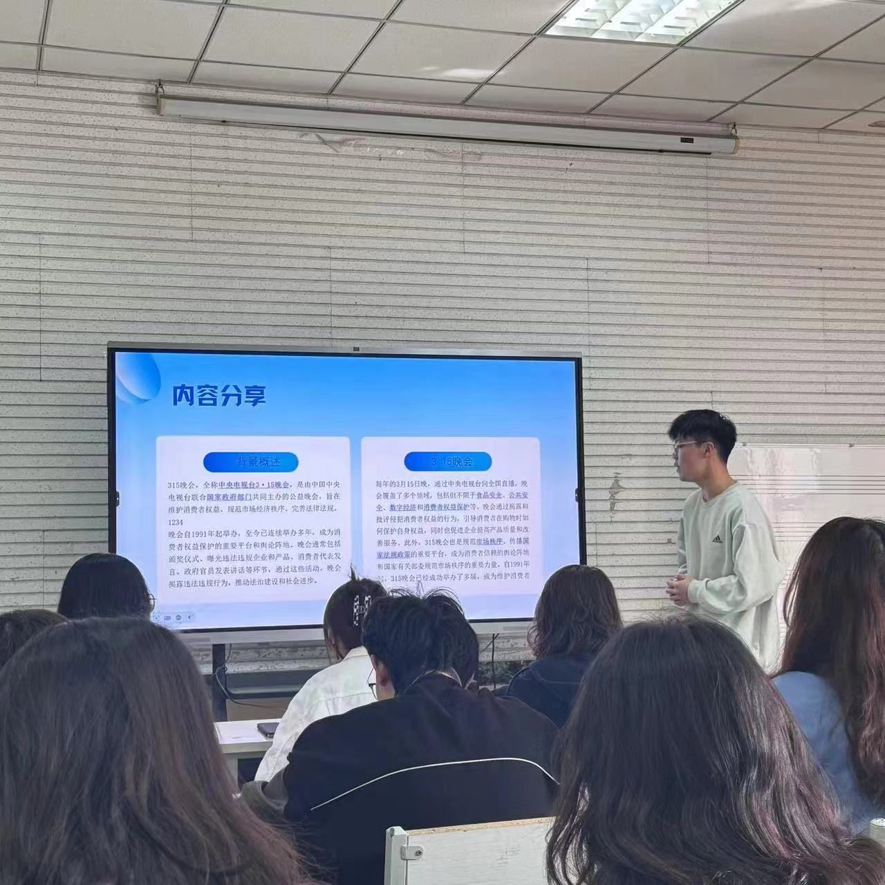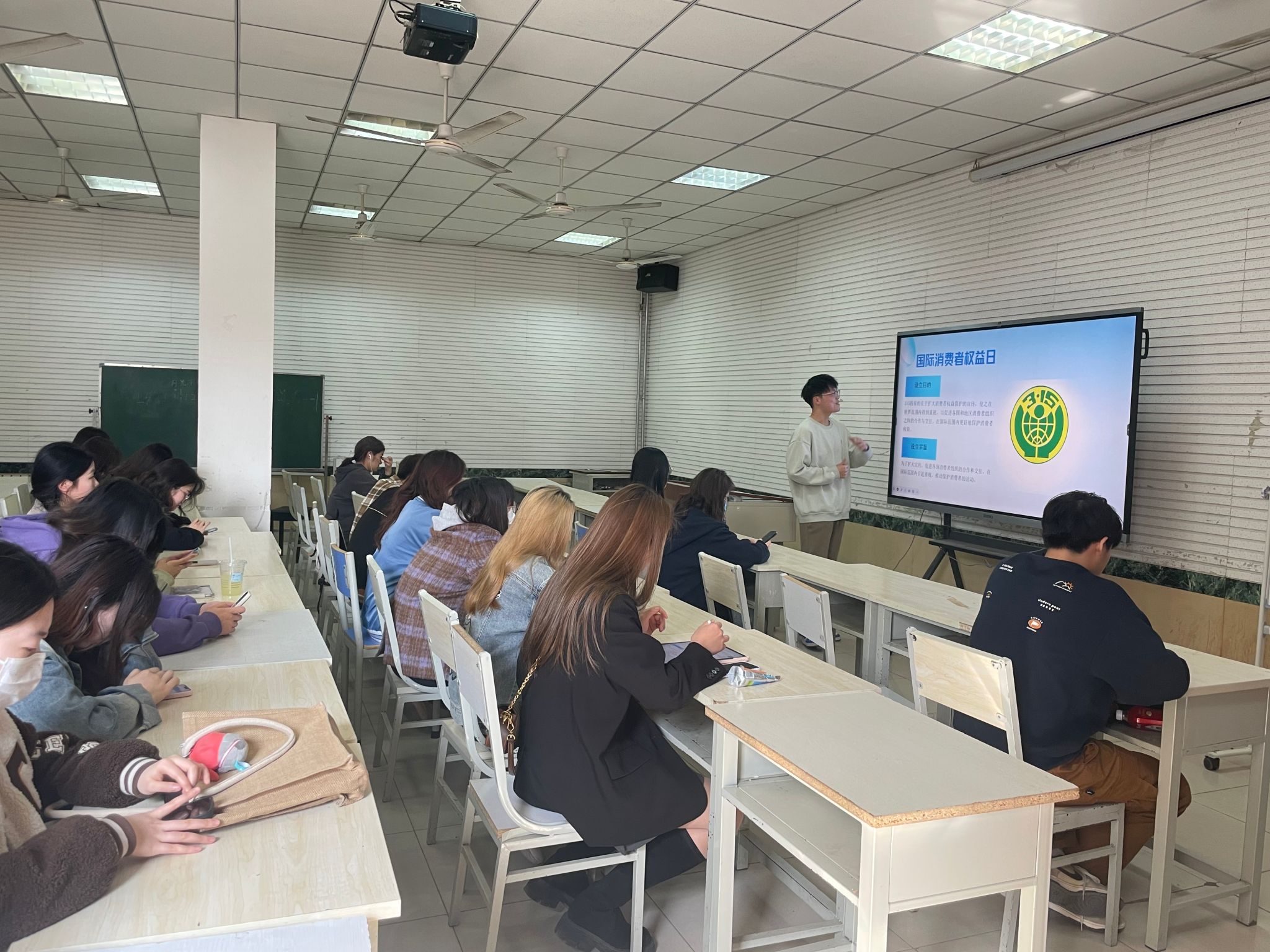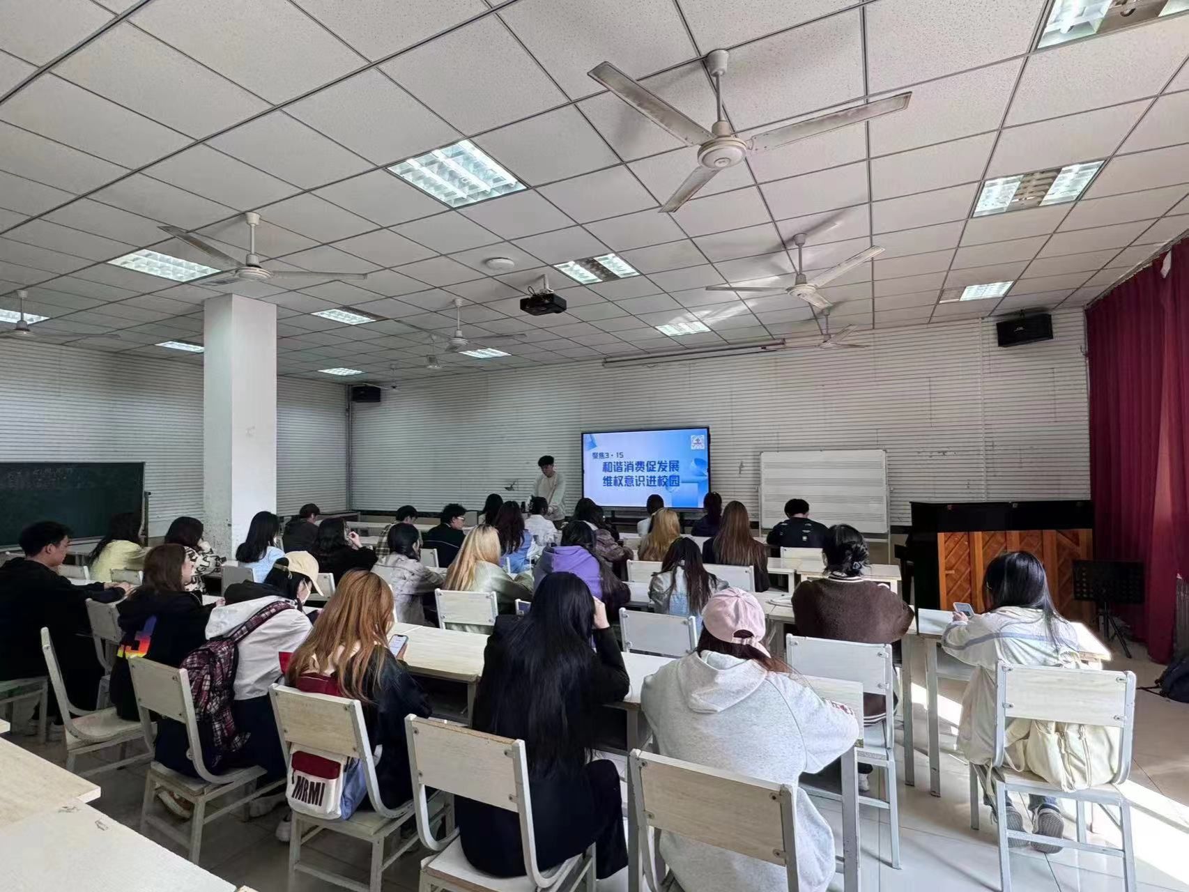 多媒体教室一举办了一场主题为“和谐消费促进发展,维权意识进校园”的主题活动。