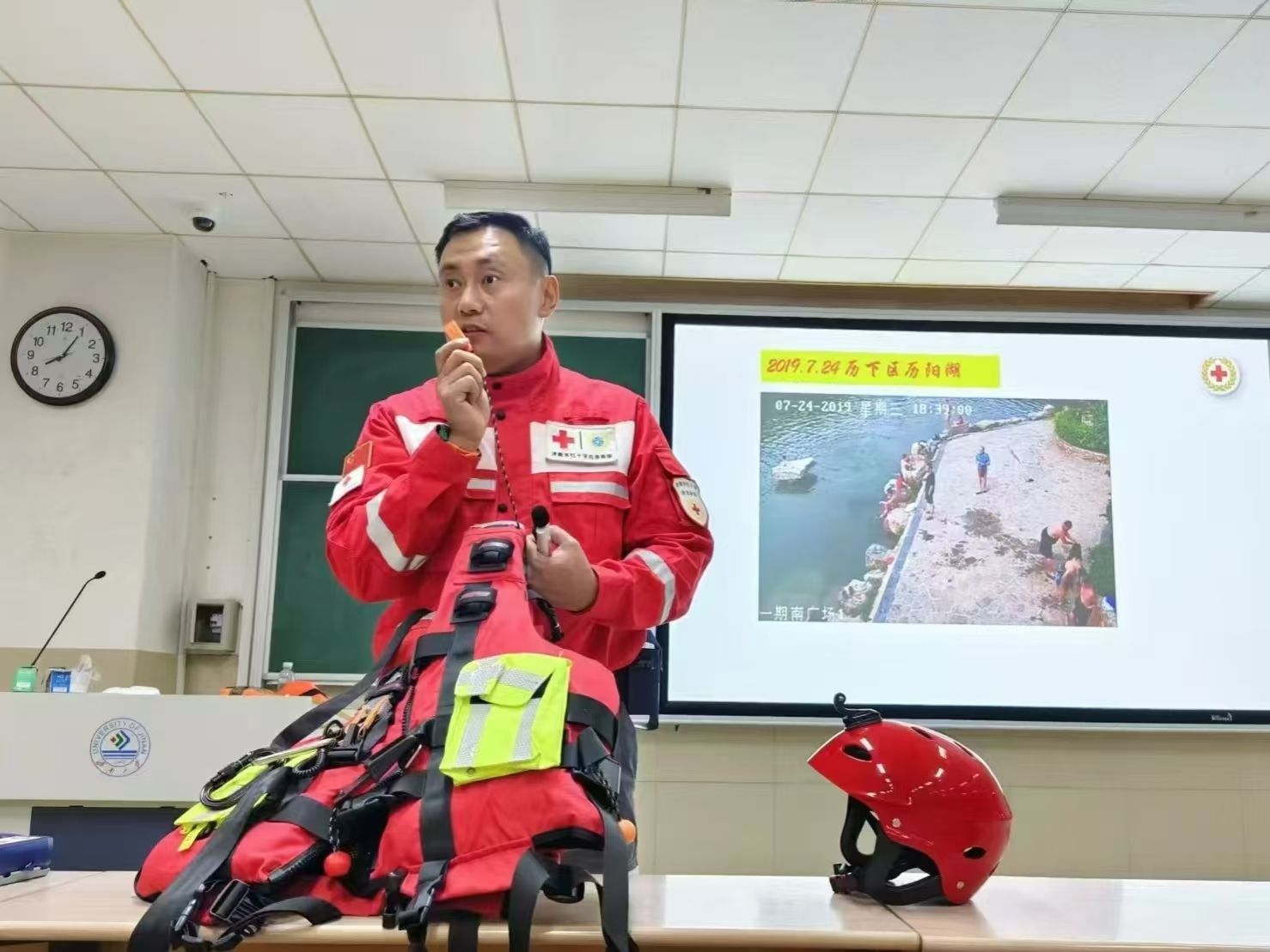 任海涛作为济南市红十字应急救援队的一员,曾多次参与全国各地特大水灾的救援工作。他从自身经验和大学生实际情况出发,对高校中近期频发的溺水、踩踏等危机事件,与同学们分享了应对措施和解决办法。同时,他建议同学们应掌握基本自救和互救技能,定期参加美高梅娱乐城